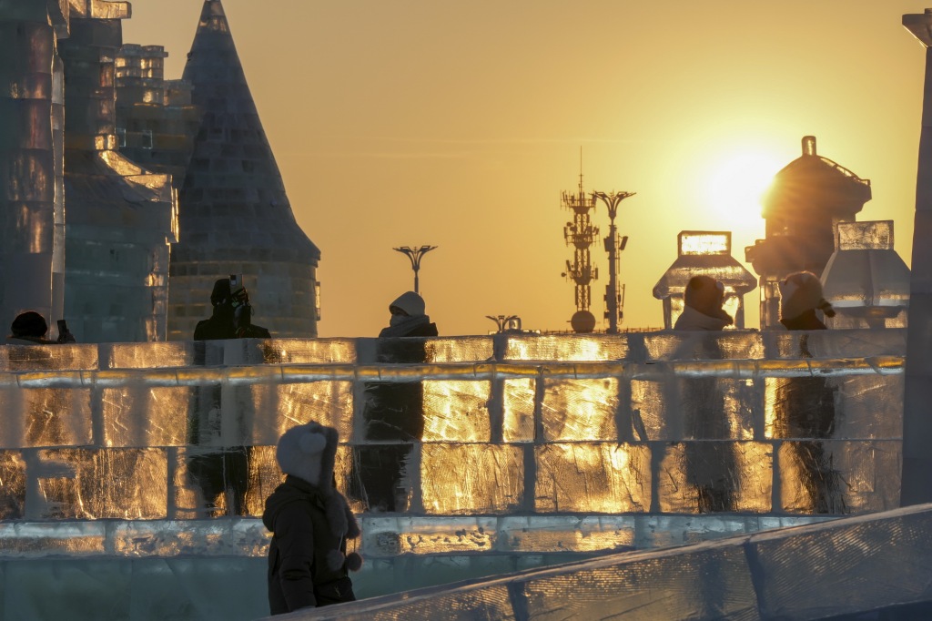 12月17日,游客在哈尔滨冰雪大世界园区内参观游玩。