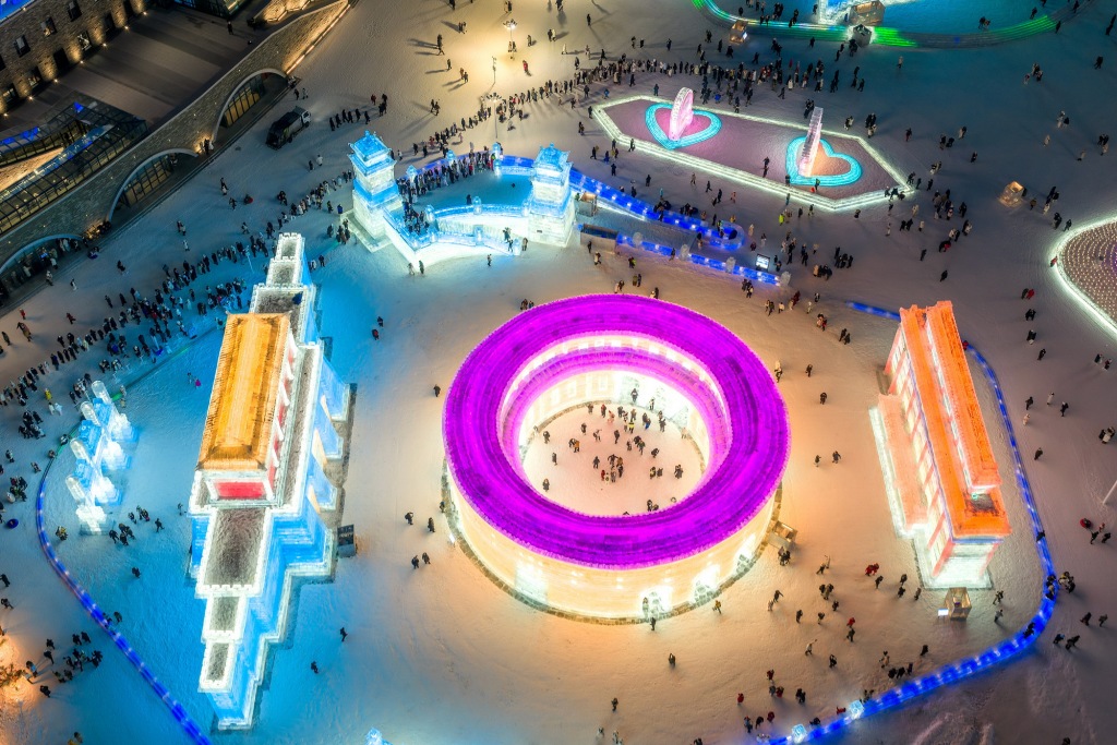 高27.4米的黄鹤楼冰建,将江南名楼的雄浑雅致与北国冰雪艺术完美融合,红色装饰勾勒出楼宇轮廓,尽显古今交融之美;福建土楼冰建则以“天圆地方”为核心造型,10.5米高、32米直径的环形围合结构,生动再现聚族而居的温馨场景,红色灯笼点缀其间,提前营造出团圆祥和的氛围。这抹灵动的中国红,让冰雪景观更添暖意,也让不少游客心生向往:“想在这里伴着红与雪,跨年迎新春!”