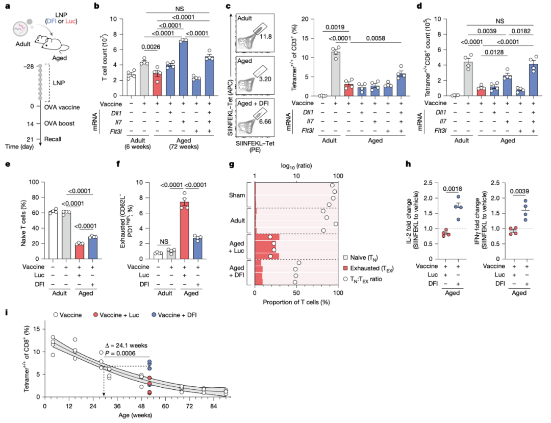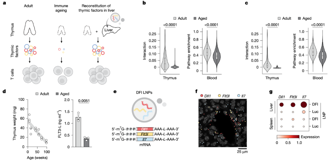 接下来,研究团队设计了一种肝脏 DFI 重建策略,:将编码这三种因子——DLL1(Notch 通路中的关键跨膜蛋白配体)、FLT3L 和 IL-7 的 mRNA 封装于脂质纳米颗粒(LNP)中,通过静脉注射靶向肝脏。肝脏具有独特的血流特点和强大的蛋白质合成能力,即使在高龄时仍保持良好功能,成为理想的临时“蛋白工厂”。