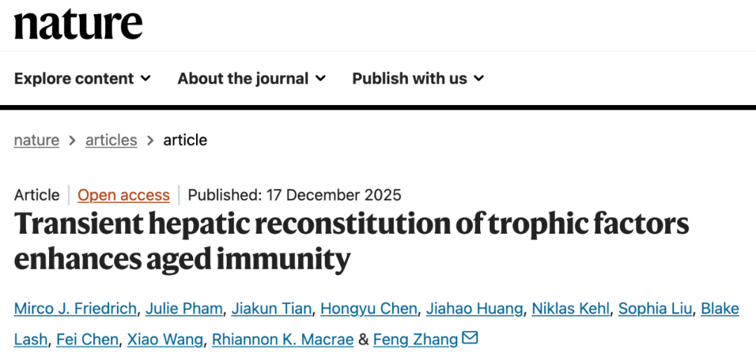 该研究以:Transient hepatic reconstitution of trophic factors enhances aged immunity(短暂的肝脏营养因子重建可增强衰老的免疫力)为题,于 2025 年 12 月 17 日在线发表于 Nature 期刊,
