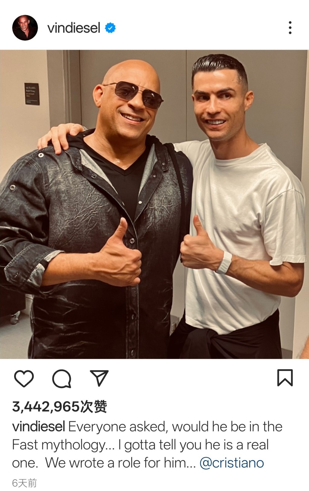 上周,“速激”系列电影主角范·迪塞尔在其社交网站上晒出他与C罗的合照,并配文——很多人都来问,他是否会加入“速激”大家庭……我想说,这是真的,我们专门为他安排了一个角色。范·迪塞尔还在文末艾特了C罗。