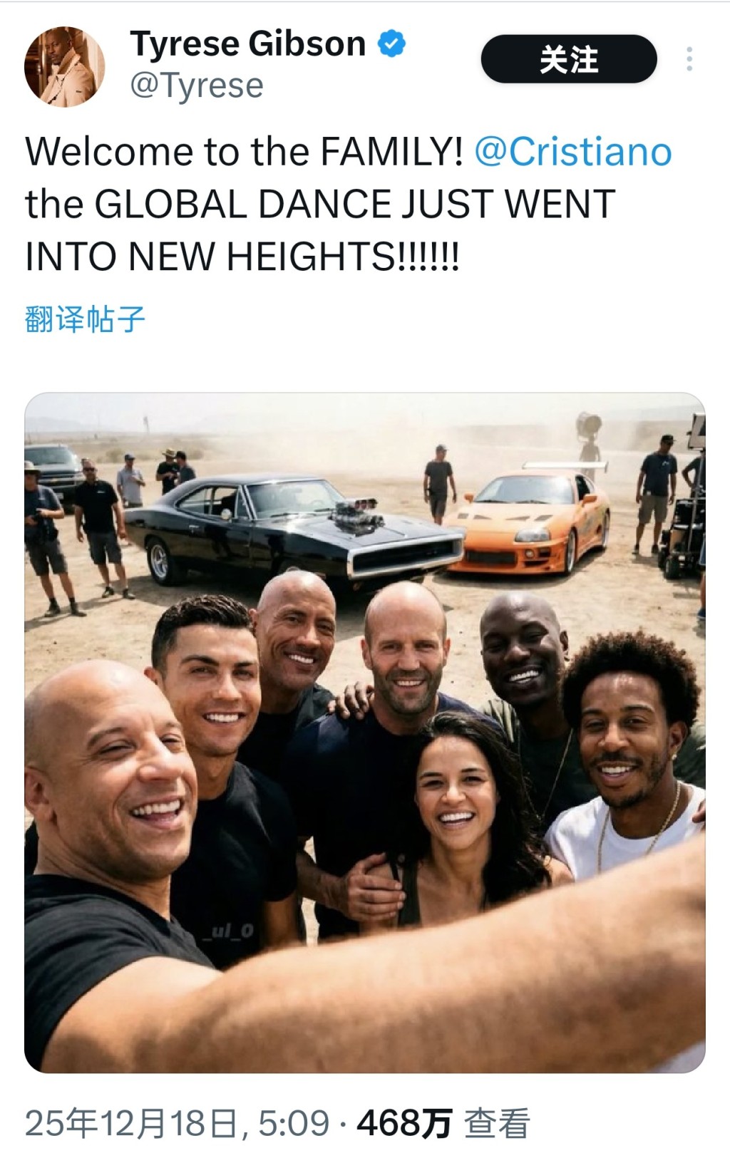 而就在12月18日,在“速激”系列电影里饰演罗曼的泰瑞斯·吉布森在其社交网站上晒出《速度与激情11》剧组工作照,C罗赫然在列。据悉,这是C罗进组拍摄的第一天。