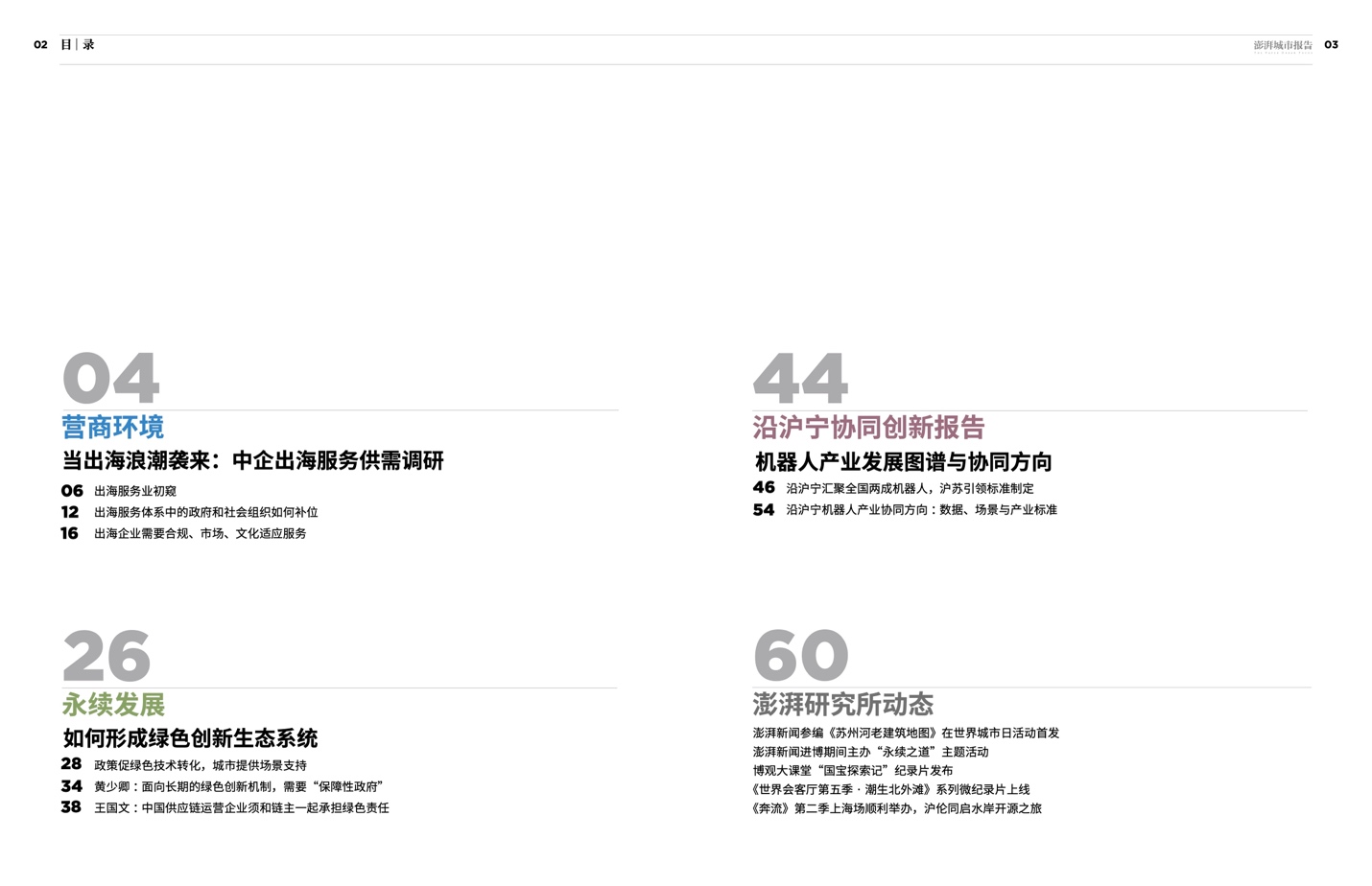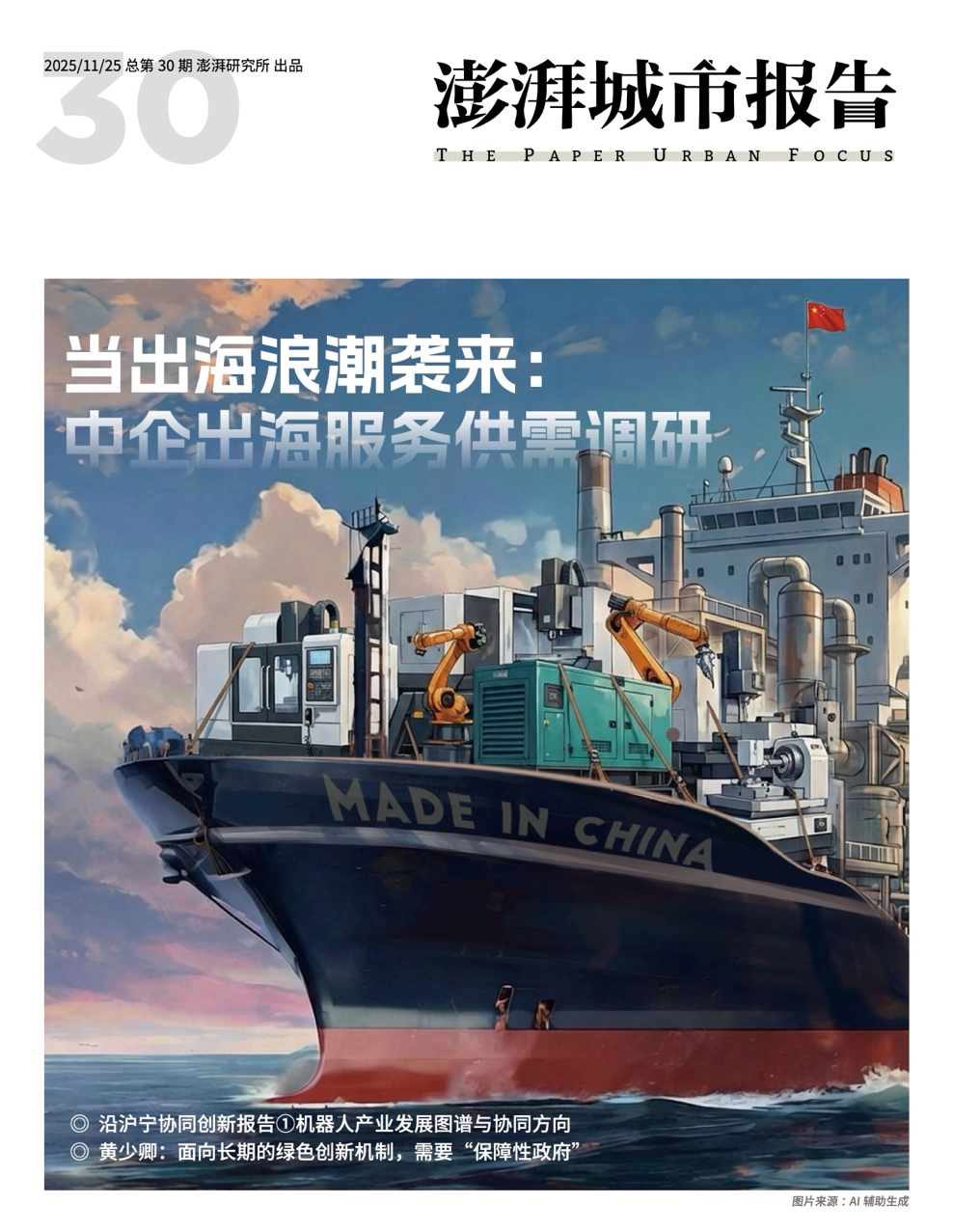 《澎湃城市报告》总第30期《当出海浪潮袭来:中企出海服务供需调研》已于11月25日发布,本报告包含《当出海浪潮袭来:中企出海服务供需调研》、《如何形成绿色创新生态系统》和《机器人产业发展图谱与协同方向》3份子报告。