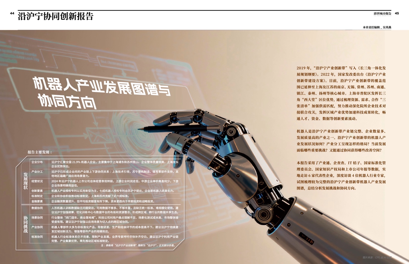 本报告采用了产业通、企查查、IT 桔子、国家标准化管理委员会、国家知识产权局和上市公司年报等数据,实地走访 6 家代表性企业,深度访谈 4 位机器人行业专家,试图梳理较为完整的沿沪宁产业创新带机器人产业发展图谱,总结分析发展挑战和协同方向。