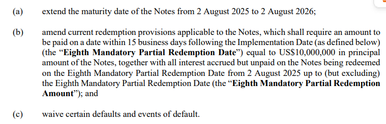 在同意征求中,发行人建议一项特别决议,内容包括将上述票据的到期日从2025年8月2日延长至2026年8月2日等。