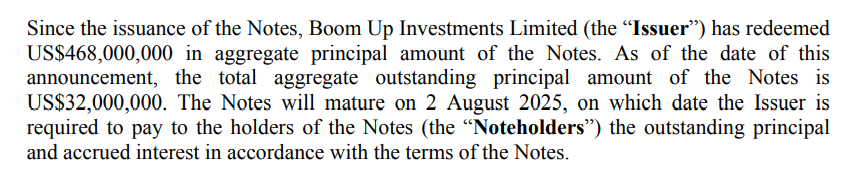 据茂升投资11月5日的公告,同意征求的决议内容还包括修订现有赎回安排,在修订生效后15个营业日内支付1000万美元本金及相应利息,完成一次“部分提前赎回”;豁免此前已发生的若干违约及潜在违约事件等。