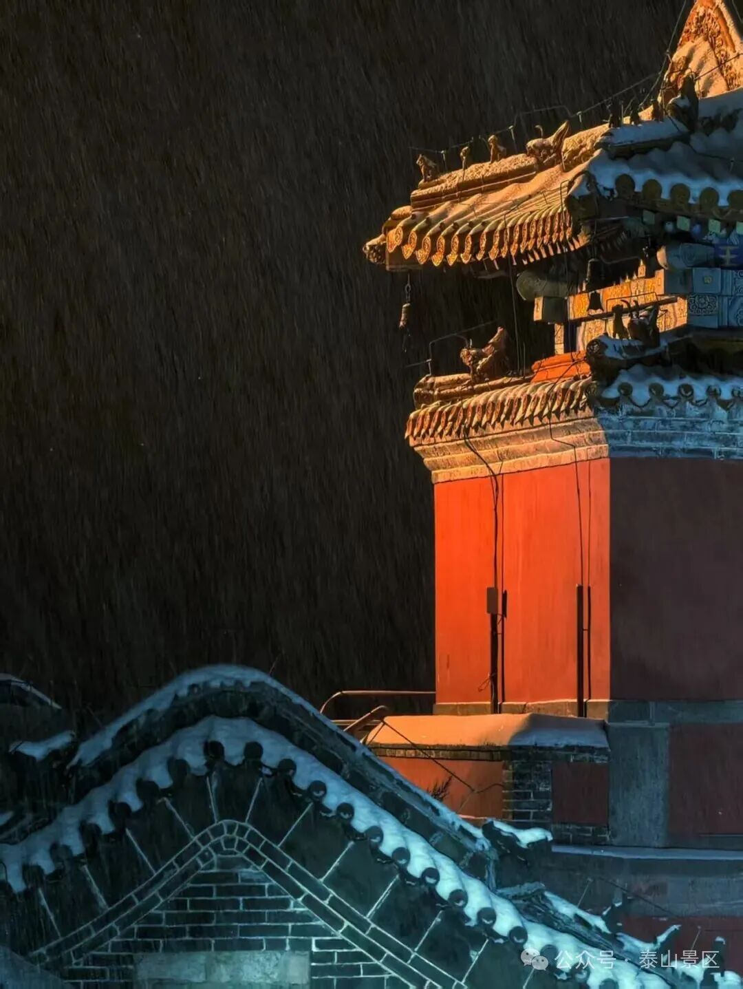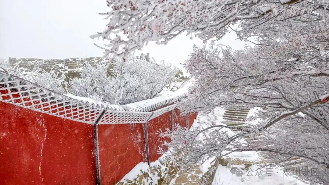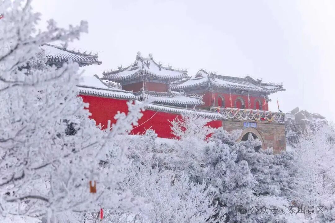 漫步山中,雾霭缭绕,玉树琼花一路相伴,红墙黛瓦的庙宇隐在冰雪林中,恍若闯入仙侠画卷。此刻的泰山,褪去了秋日的层林尽染,以冰雪为墨,绘出了一幅独属于冬日的齐鲁仙境。