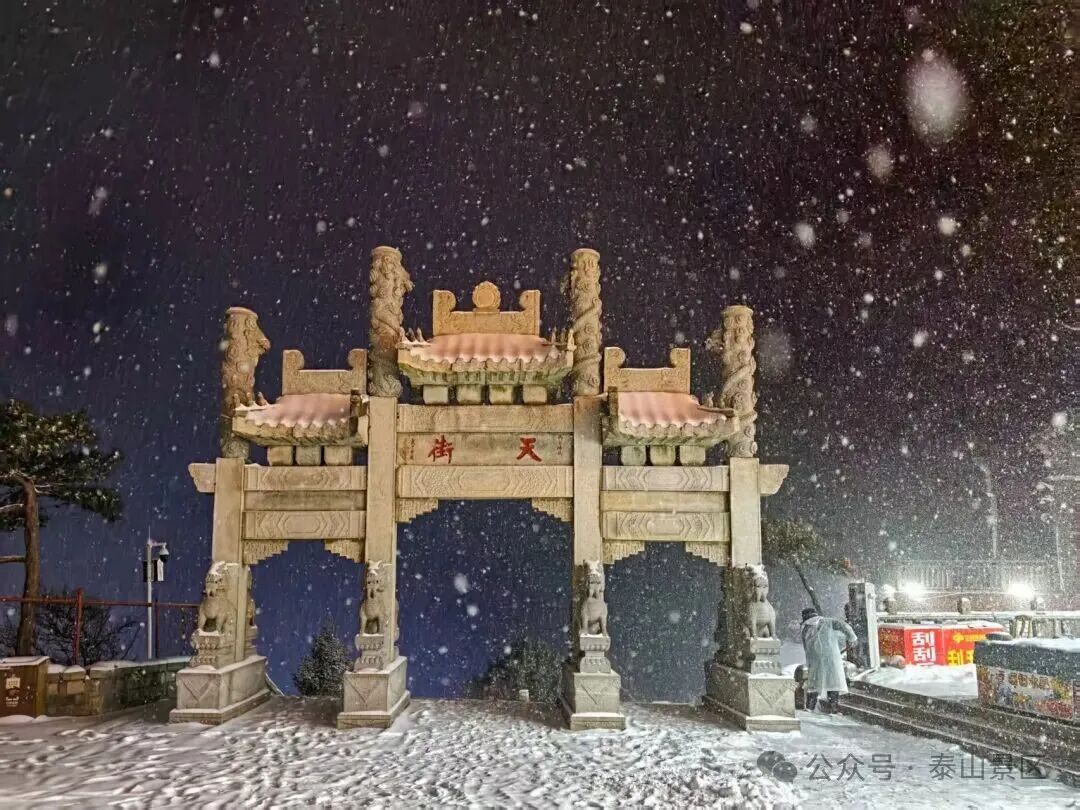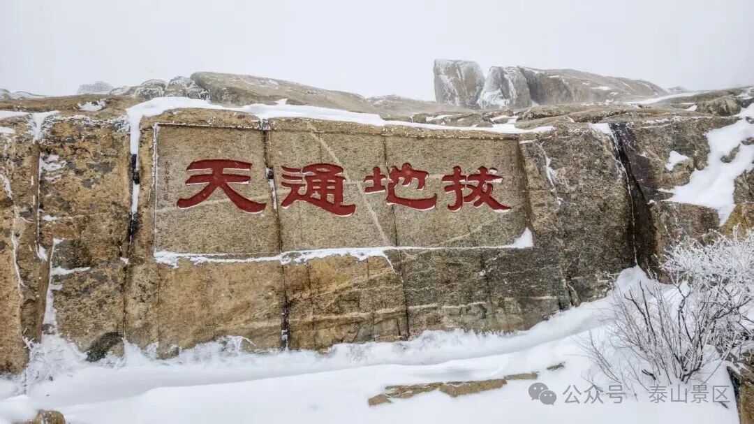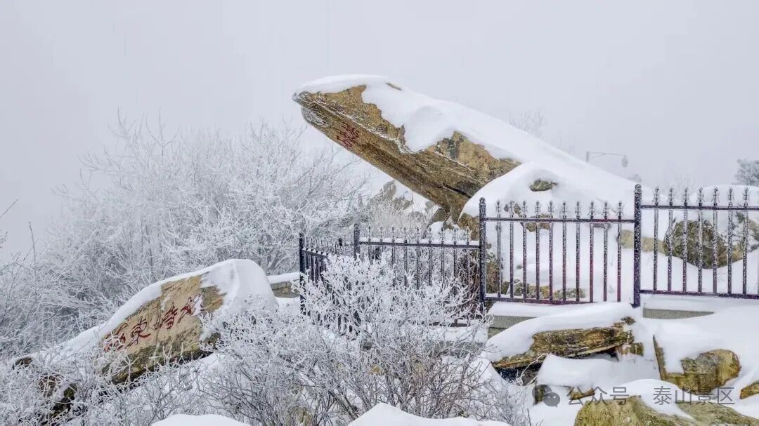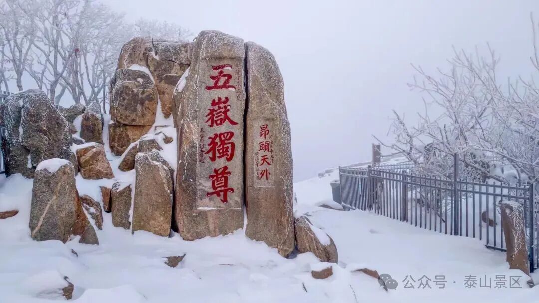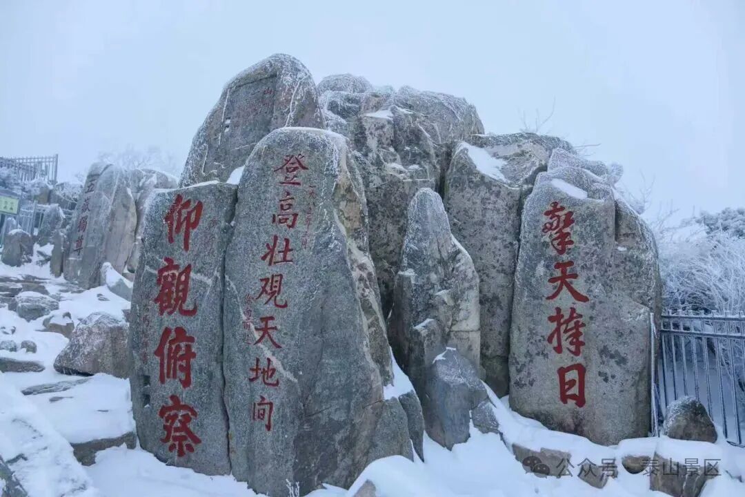 登上十八盘,往日巍峨的石阶覆上薄雪,南天门的红墙金瓦在冰雪映衬下,添了几分清冷的诗意。“五岳独尊”的石刻凝着霜雪,苍劲的字迹与琼枝玉树相映,尽显泰山的雄奇与温婉。