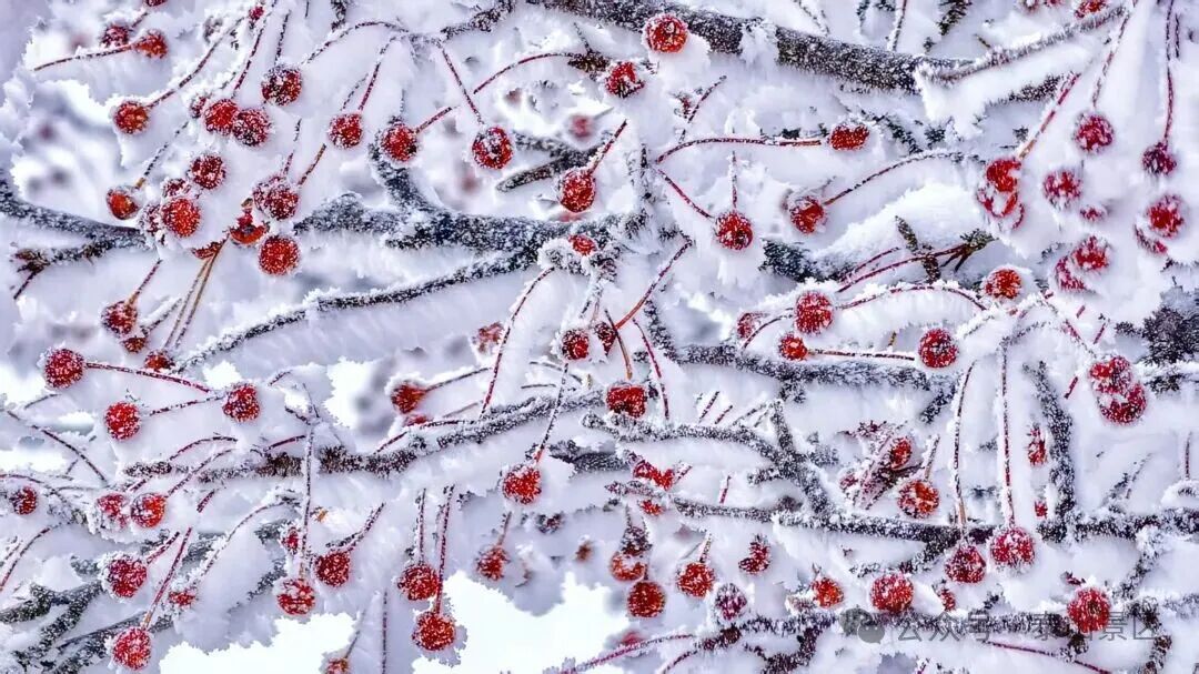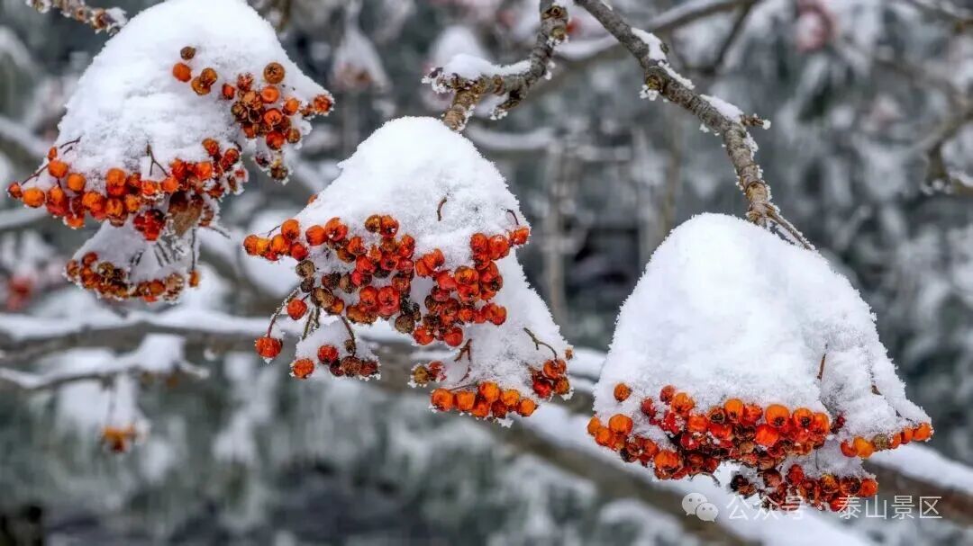 山间的雾凇是冬日最惊艳的笔触,松针裹着冰晶,似玉枝垂挂;野果凝雪,红果点点嵌在白絮间,成了冰雪里最鲜活的色彩。雾凇满枝的古松如披银甲,在寒风中挺立,将泰山的风骨藏在冰雪雕琢的轮廓里。