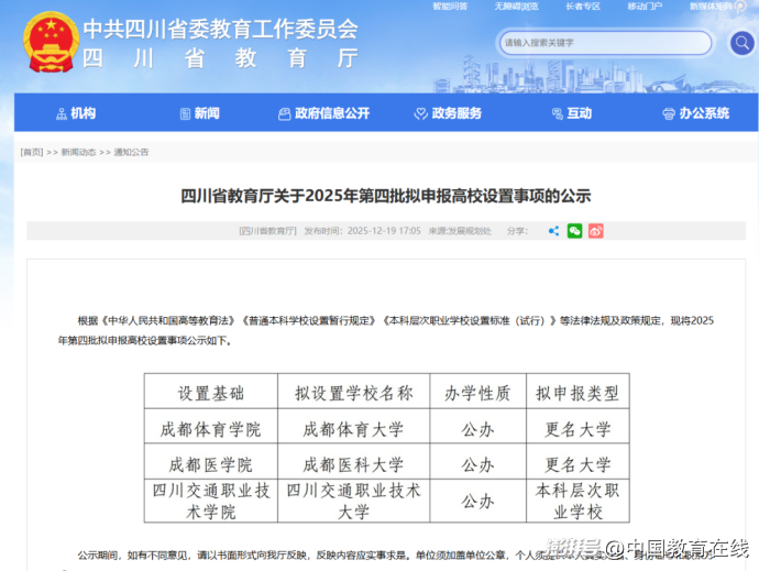 12月19日,四川省教育厅发布《关于2025年第四批拟申报高校设置事项的公示》。
