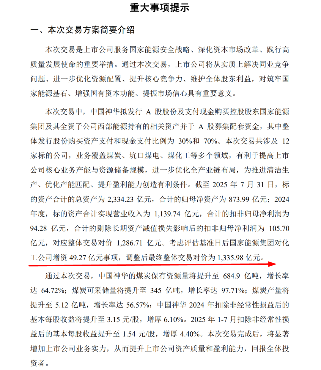 中国神华(601088.SH)今日公告称,拟通过发行A股股份及支付现金的方式购买国家能源集团持有的国源电力100%股权、新疆能源100%股权、化工公司100%股权、乌海能源100%股权、平庄煤业100%股权、神延煤炭41%股权、晋神能源49%股权、包头矿业100%股权、航运公司100%股权、煤炭运销公司100%股权、港口公司100%股权,并以支付现金的方式购买西部能源持有的内蒙建投100%股权;同时,上市公司拟向不超过35名特定投资者发行A股股份募集配套资金。交易价格1335.98亿元。