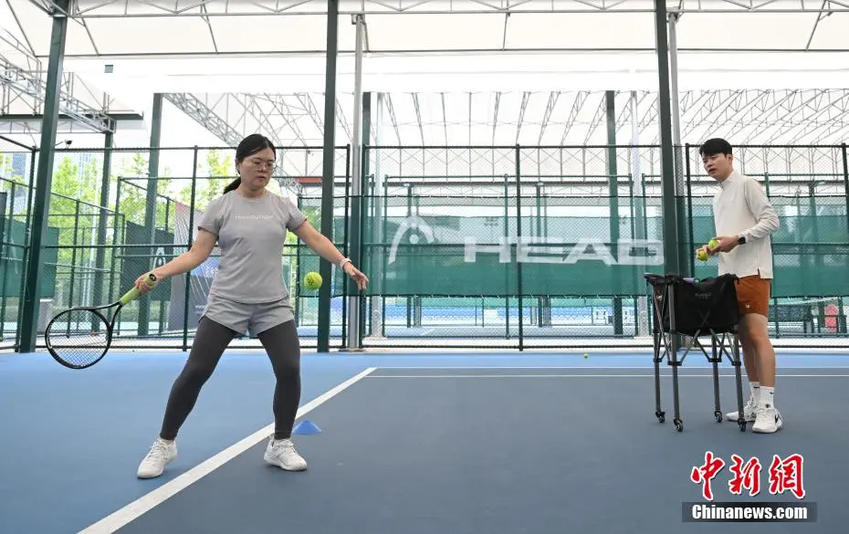 网球爱好者在杭州奥体中心网球中心室外健身场地练习网球(资料图)。中新社记者 王刚 摄