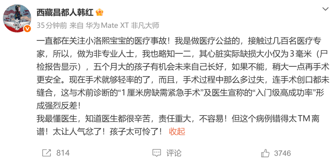 原标题:《5月龄女婴小洛熙心脏手术后离世,家长公布尸检报告:未检见冠状窦型房间隔缺损,肋骨间切开的创口未缝合;韩红发声:这个病例错得太离谱》
