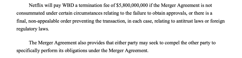 拴住奈飞的“诚意保证金”——58亿美元分手费。这条是约束奈飞的,而且金额特别巨大,是整份协议最关键的部分。最主要、几乎唯一的原因就是:政府不批准。比如,美国或欧洲的反垄断机构认为两家公司合并后市场权力过大,会妨碍公平竞争,从而一票否决。