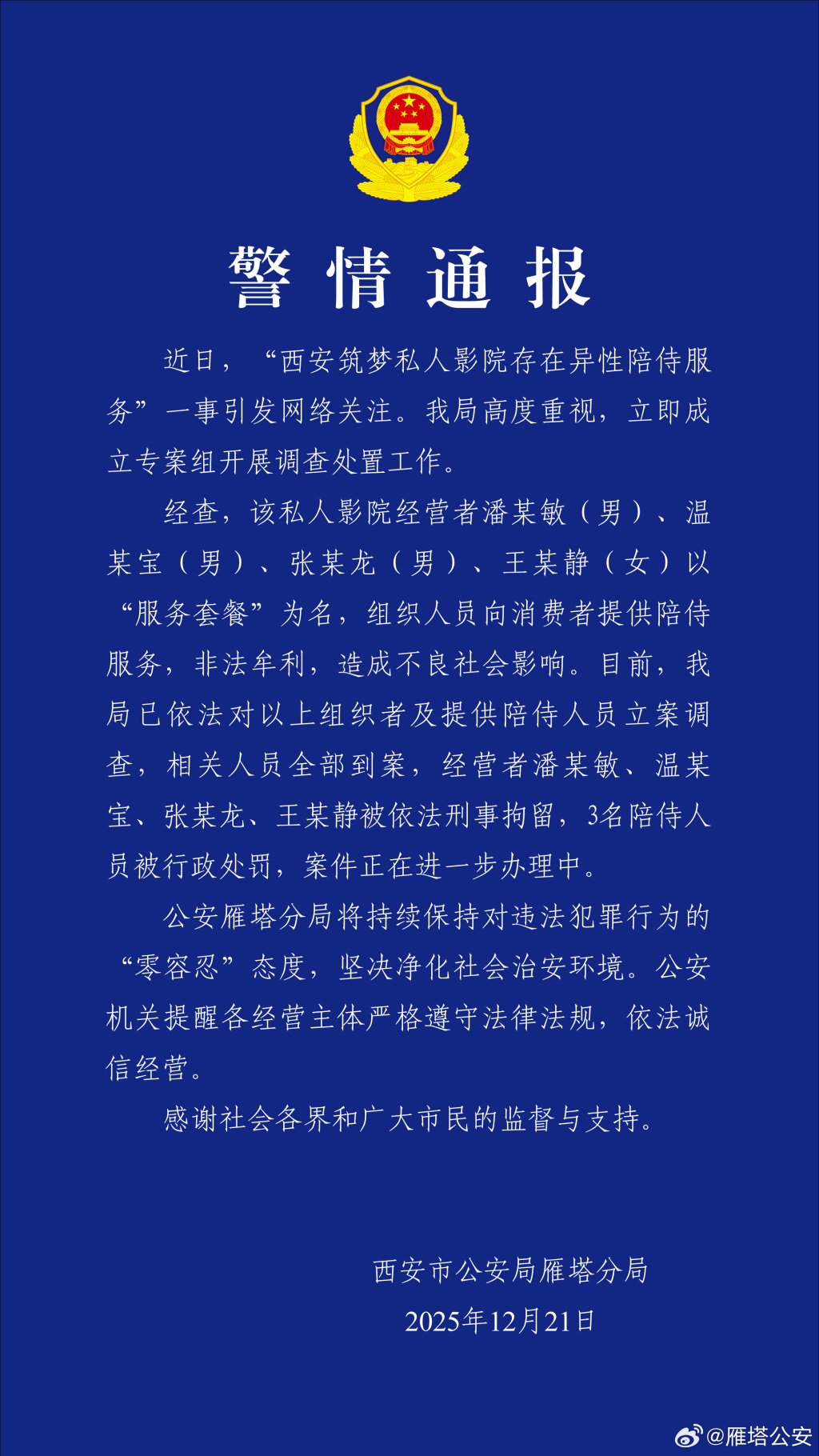 12月21日下午,针对“西安筑梦私人影院存在异性陪侍服务”一事,西安市公安局雁塔分局官方微博发布警情通报。通报中称,已对该私人影院经营者及提供陪侍人员立案调查,相关人员全部到案,4名经营者被依法刑事拘留,3名陪侍人员被行政处罚,案件正在进一步办理中。