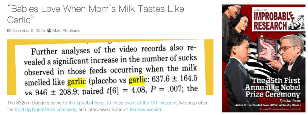 2025年搞笑诺奖关于蒜味母乳的研究 | 图源:Ig Nobel prize官网截图