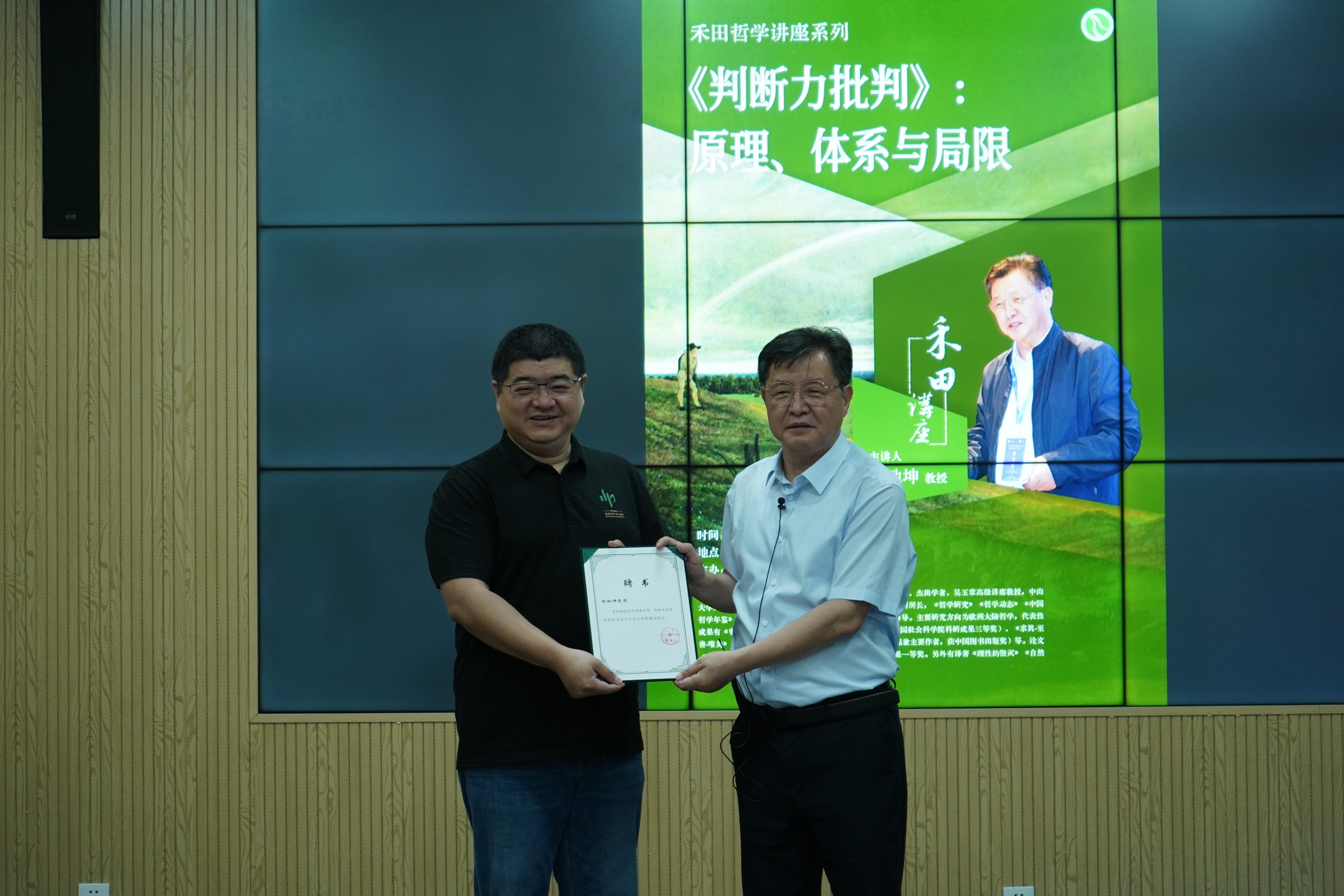 中山大学哲学系主任张伟为谢地坤颁发“禾田哲学讲座”聘书