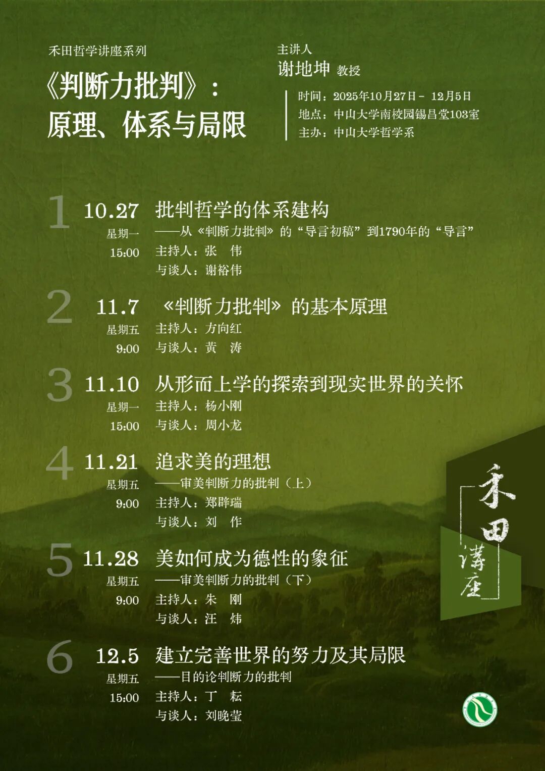 2025年10月27日至12月5日,中山大学禾田哲学系列讲座“《判断力批判》:原理、体系与局限”共六讲,在中山大学南校园锡昌堂103讲学厅举行,主讲人为中国人民大学哲学院教授、中山大学人文高等研究院特邀访问教授谢地坤。禾田哲学讲座是中大哲学系的高端讲座系列,旨在邀请海内外顶尖学者前来广州,围绕其深研领域分享思考成果。作为本次系列讲座主题的《判断力批判》一书,是康德(Immanuel Kant, 1724-1804)批判哲学体系的最后一部著作,出版于1790年,探讨了审美鉴赏和目的论等问题,与《纯粹理性批判》和《实践理性批判》一道合称“三大批判”,被康德看作其批判工作的完成。在系列讲座举行之前,由商务印书馆出版的“康德三大批判套装本”于10月11日在中山大学深圳校区顺利举办发布会。作为套装本中《判断力批判》新译本的译者,本系列讲座主讲人谢地坤教授基于其翻译经验与研究成果,对该书的基本概念、主要原理、体系结构及理论限度进行深入探讨。