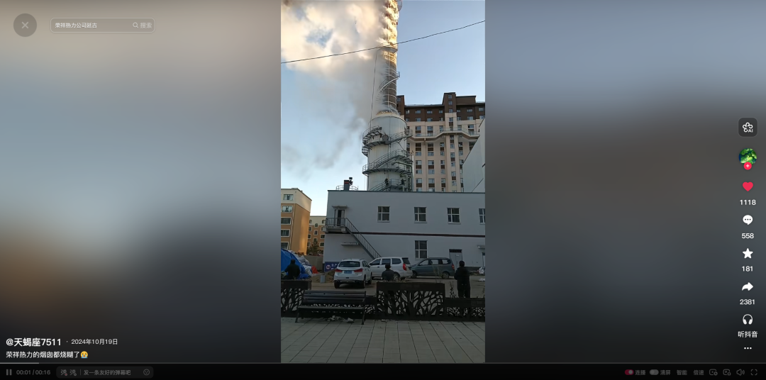 社交平台多名用户发布的视频拍摄角度与网传画面基本一致,配文多标注为“吉林延吉一热力烟囱起火”。