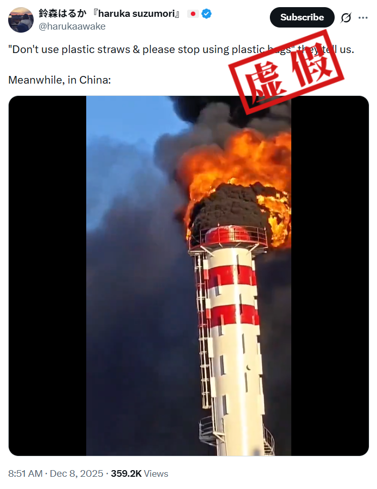 近日,海外社交平台流传一则视频。视频配文称:“在告知人们停止使用塑料吸管和塑料袋的同时,在中国……”画面中可见,一座烟囱喷出大量黑色浓烟,烟雾呈蘑菇云状,并伴有火光闪现。部分账号据此声称,这是“中国工厂排放出的有毒烟雾”。