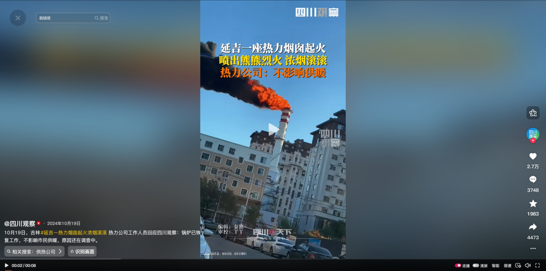 其中,中国媒体四川观察在2024年10月19日最早报道了该事件。报道称,视频画面为当日吉林省延吉市一座热力烟囱起火。视频左下角标注,素材来源为网友投稿。延边荣祥热力有限公司工作人员在接受采访时表示,锅炉已恢复运行,不影响市民供暖,起火原因仍在调查中。