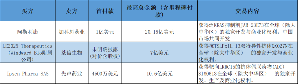 12月21日和22日,国内医药行业先后官宣了三笔BD交易,包括加科思(1167.HK)与阿斯利康、荃信生物(2509.HK)与Windward Bio附属公司LE2025 Therapeutics、先声药业(2096.HK)与Ipsen Pharma SAS。