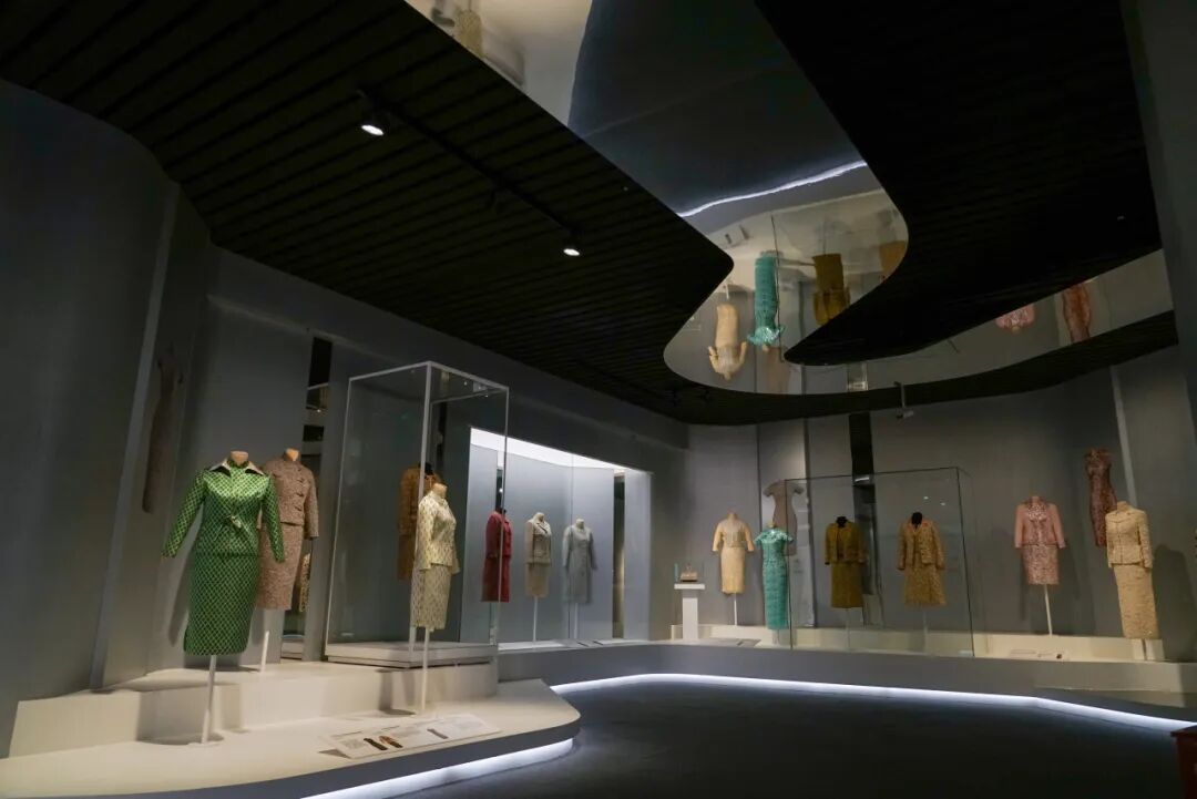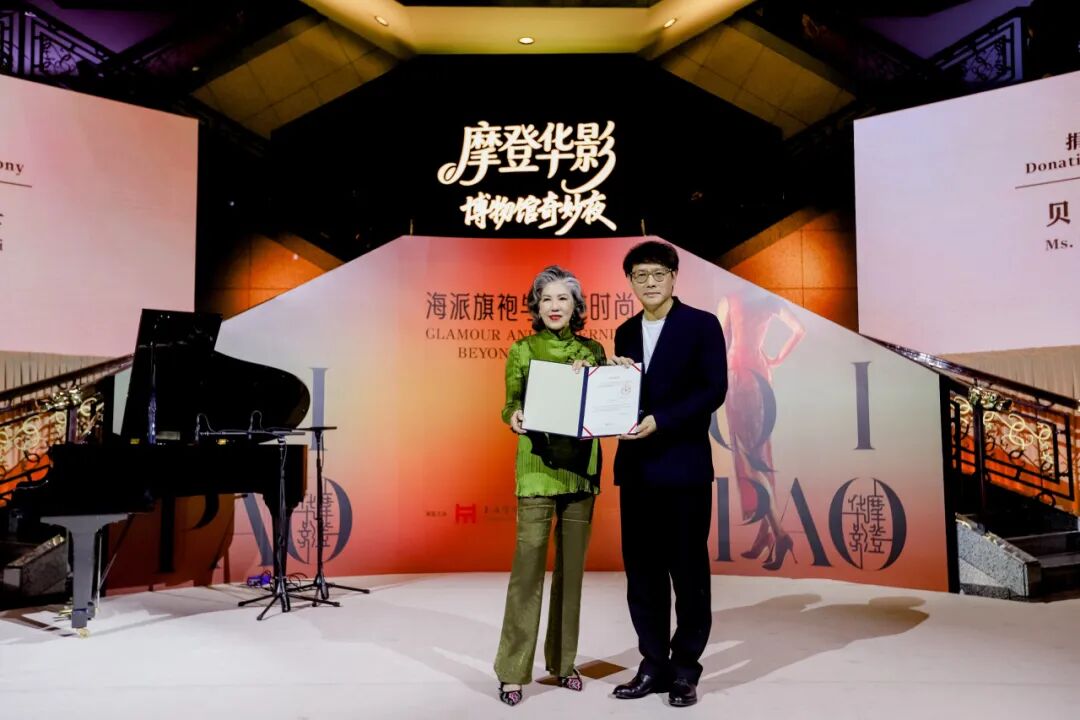 本次展览中20世纪40年代至80、90年代的展品主要为贝洽女士母亲——蒋士云女士的珍贵旗袍及配饰,这些展品完美诠释了中西融合的服饰美学。贝洽女士是“上海博物馆美国之友”基金会创始人,并担任主席至今。2017年她曾致函上海博物馆,表示愿意将其母亲蒋士云女士收藏的274件旗袍服饰无偿捐赠给上博,希望这份对百年时尚的独特感悟和对中西融合之服饰美学的深刻理解,随藏品入馆而永续流传。在展览开幕当日,上海博物馆为贝洽女士举办了捐赠仪式。