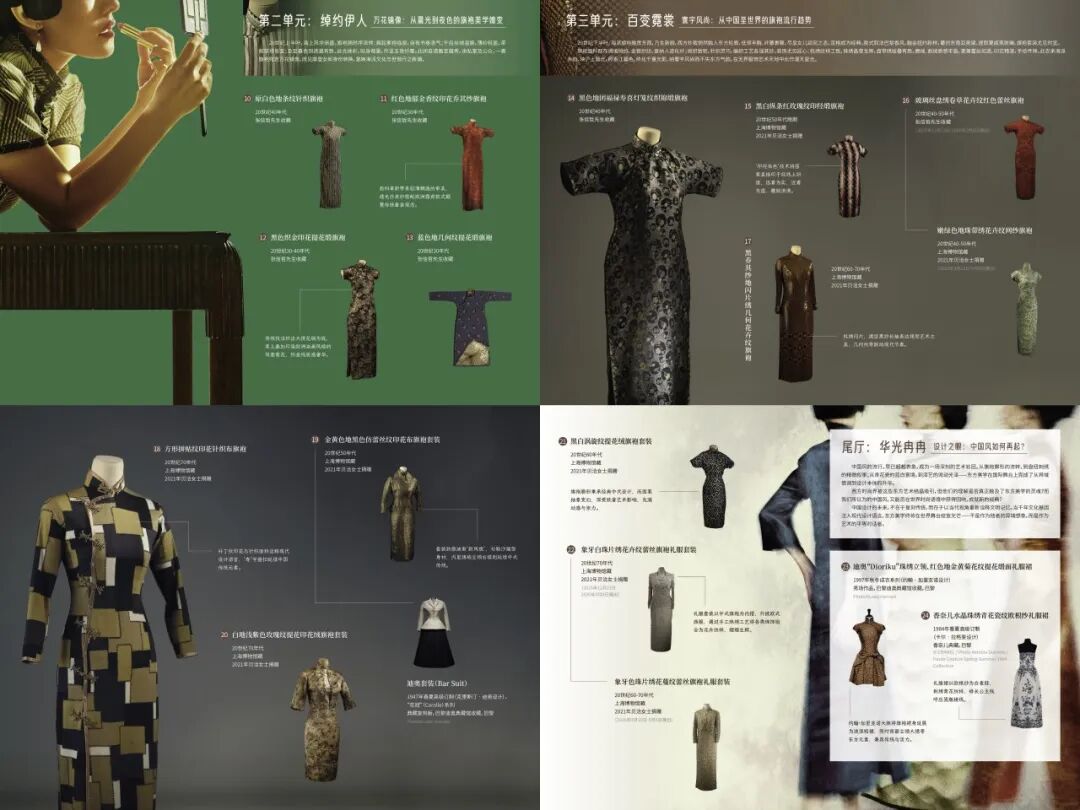 展览共分为五大版块。序厅展示旗袍发展的廓形变化;第一单元讲述旗袍的诞生、繁荣以及旗袍摩登浪潮和无界美学搭配;第二单元展示时髦旗袍的穿着搭配和场合;第三单元阐述海派旗袍发展过程以及与世界潮流同步的优雅姿态;尾厅则聚焦世界时尚对于旗袍服饰元素的认可和从中汲取灵感进行再设计的成果。