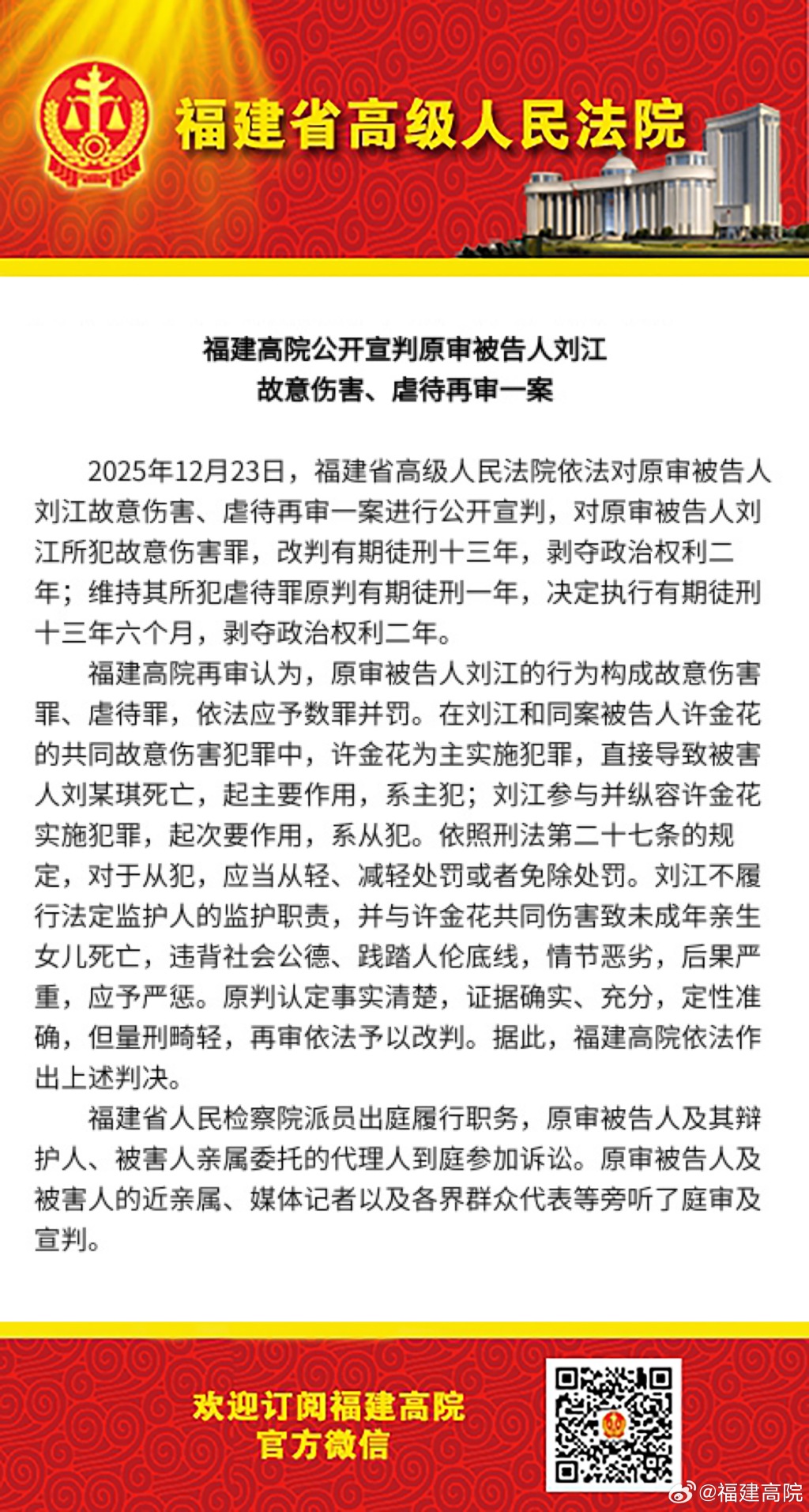 福建高院:莆田12岁女孩被虐死案原判对生父量刑畸轻,改判十三年半