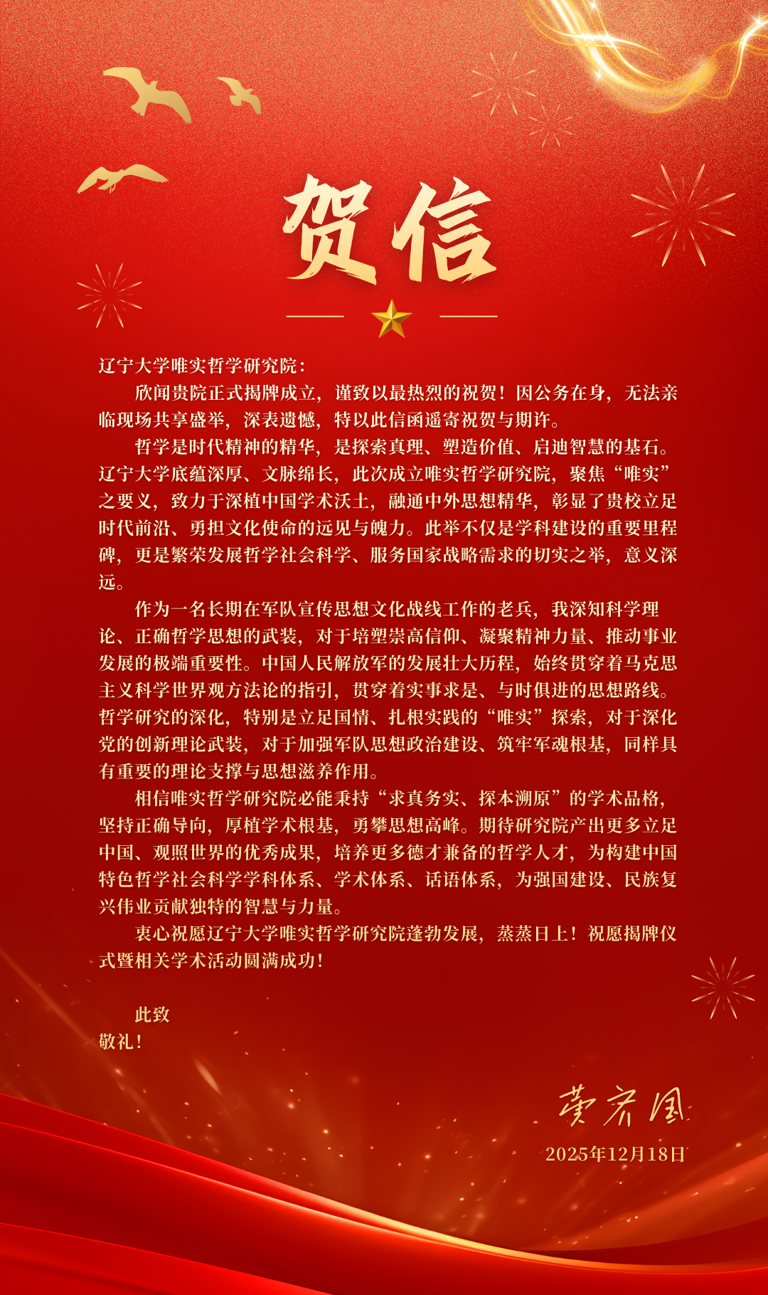 中国人民解放军电视宣传中心原总监、北京大学客座教授黄齐国同志因公未能亲临唯实哲学研究院揭牌仪式,特致贺信:祝贺研究院揭牌,赞辽大以“唯实”为要深耕学术、融通中外,称此举是学科建设里程碑与服务国家战略的务实之举。作为部队宣传战线老兵,他强调“唯实”哲学对强化理论武装、助力部队思政建设的价值,期许研究院秉持求真品格,产出立足中国的成果,为学科体系构建与强国事业献力。
