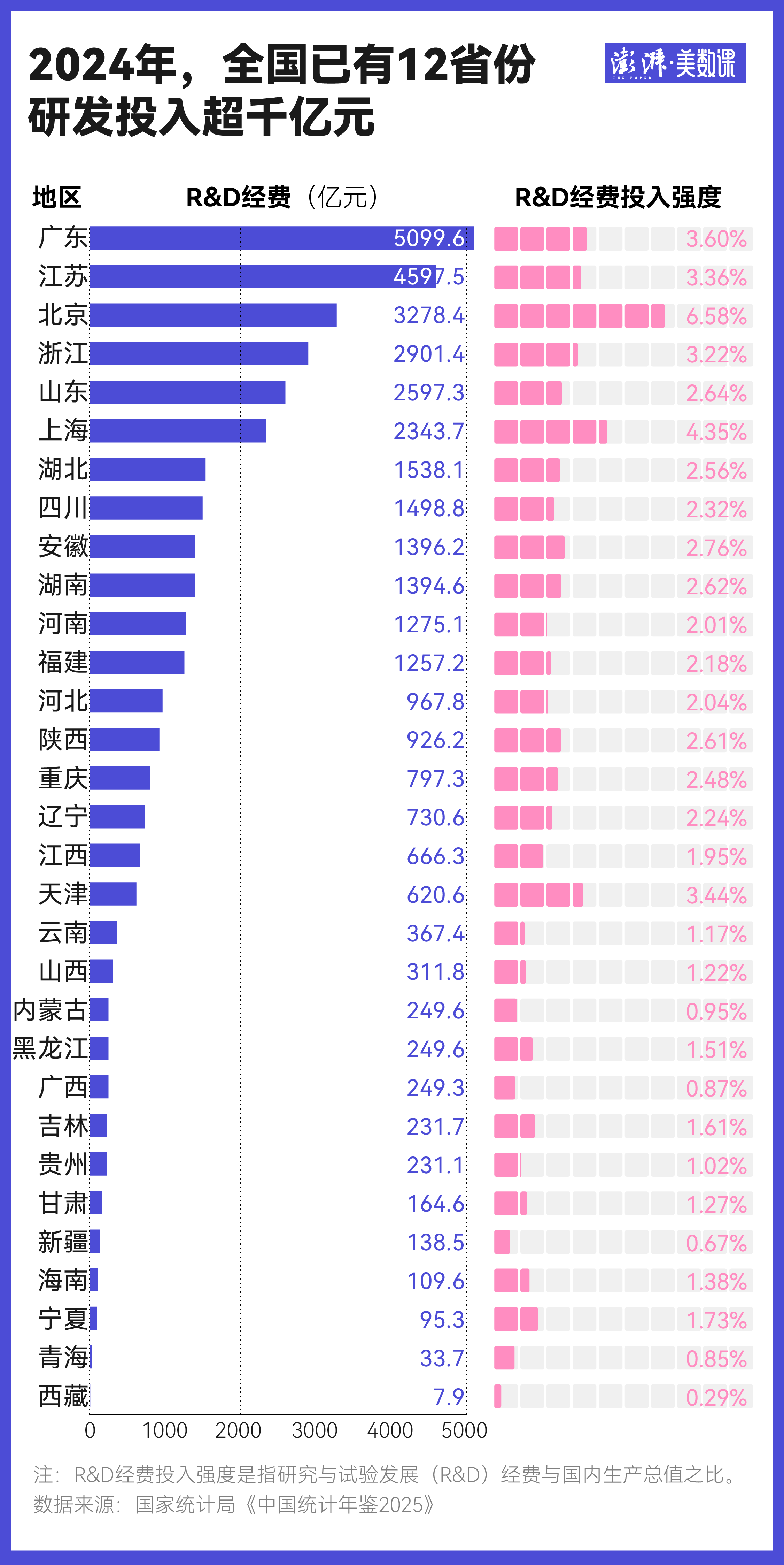 需要补充说明的是,研发是一项高投入、长周期的过程,这也是为什么R&D经费排名靠前的省份,往往也是GDP排名靠前、行业头部公司较多的省份。2024年,研发经费投入超千亿元的省份已从2014年的4个增长到了12个,这些省份也是2024年GDP排名最高的12个。