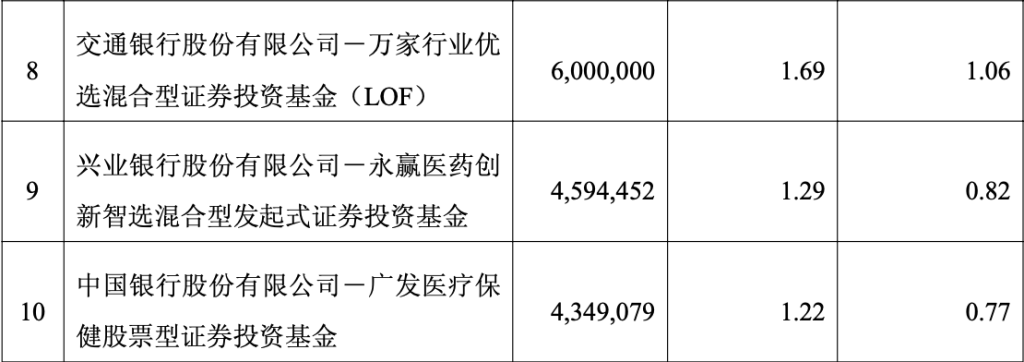 12月19日,荣昌生物(688331)披露的前十大股东持股情况显示,截至2025年12月15日,万家基金黄兴亮管理的万家行业优选、永赢基金单林管理的永赢医药创新智选、广发基金吴兴武管理的广发医疗保健,分别位列第8至第10大股东,持股数量依次为600万股、459.45万股、434.91万股。