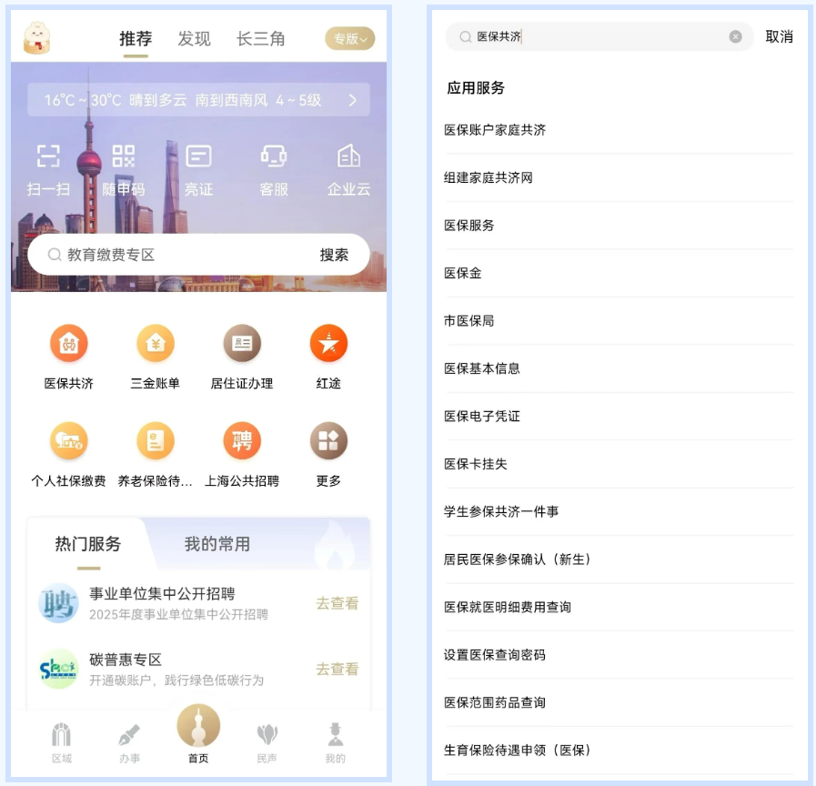 打开“随申办市民云”APP,首页搜索“医保共济”,选择“医保账户家庭共济”服务。