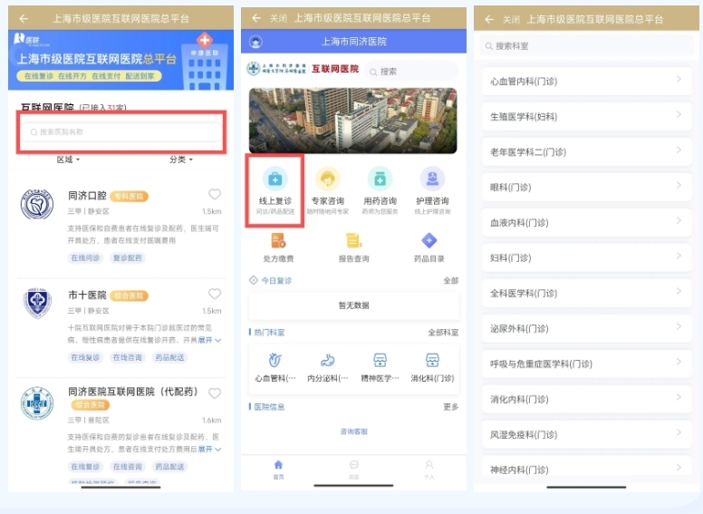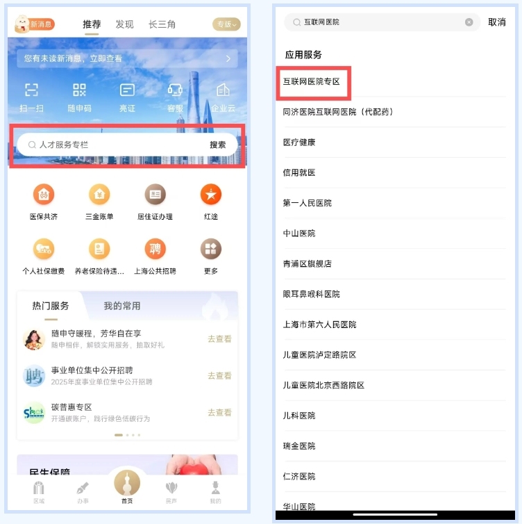 打开“随申办市民云”APP,首页搜索关键词“互联网医院”,点击即可进入对应服务。