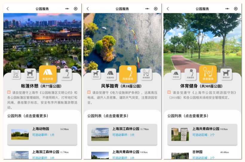 大家还可以根据游玩需求,选择具有「帐篷休憩」、「风筝踏青」、「体育健身」等功能的公园。