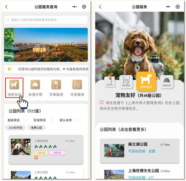 服务还按功能对公园进行划分,计划携宠出游的朋友们直接点击进入「宠物友好」,即可一键查询全市符合条件的公园信息。