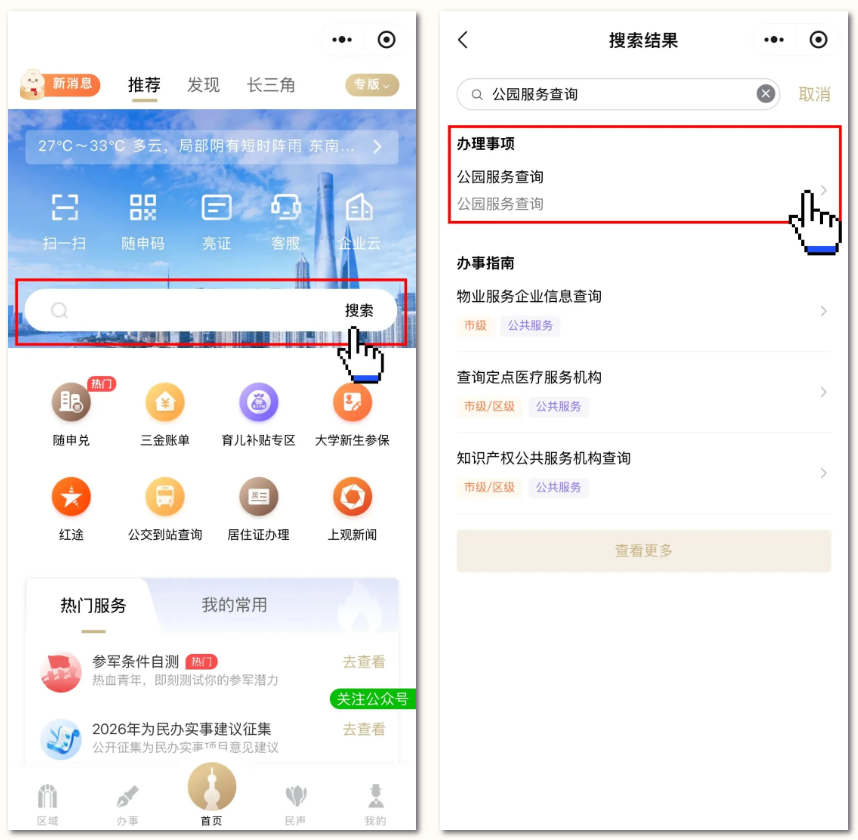 打开“”随申办市民云APP,首页搜索栏输入“公园服务查询”点击进入。