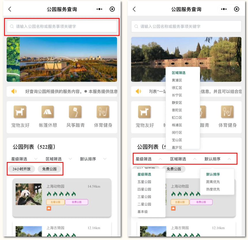 服务整合了全市522座城市公园信息,方便市民随时随地查询了解、获取公园位置、开放时间、公园历史、景观特色等信息,大家还可以根据区域、星级、24小时开放、免费公园等标签快速筛选查找心仪的公园。
