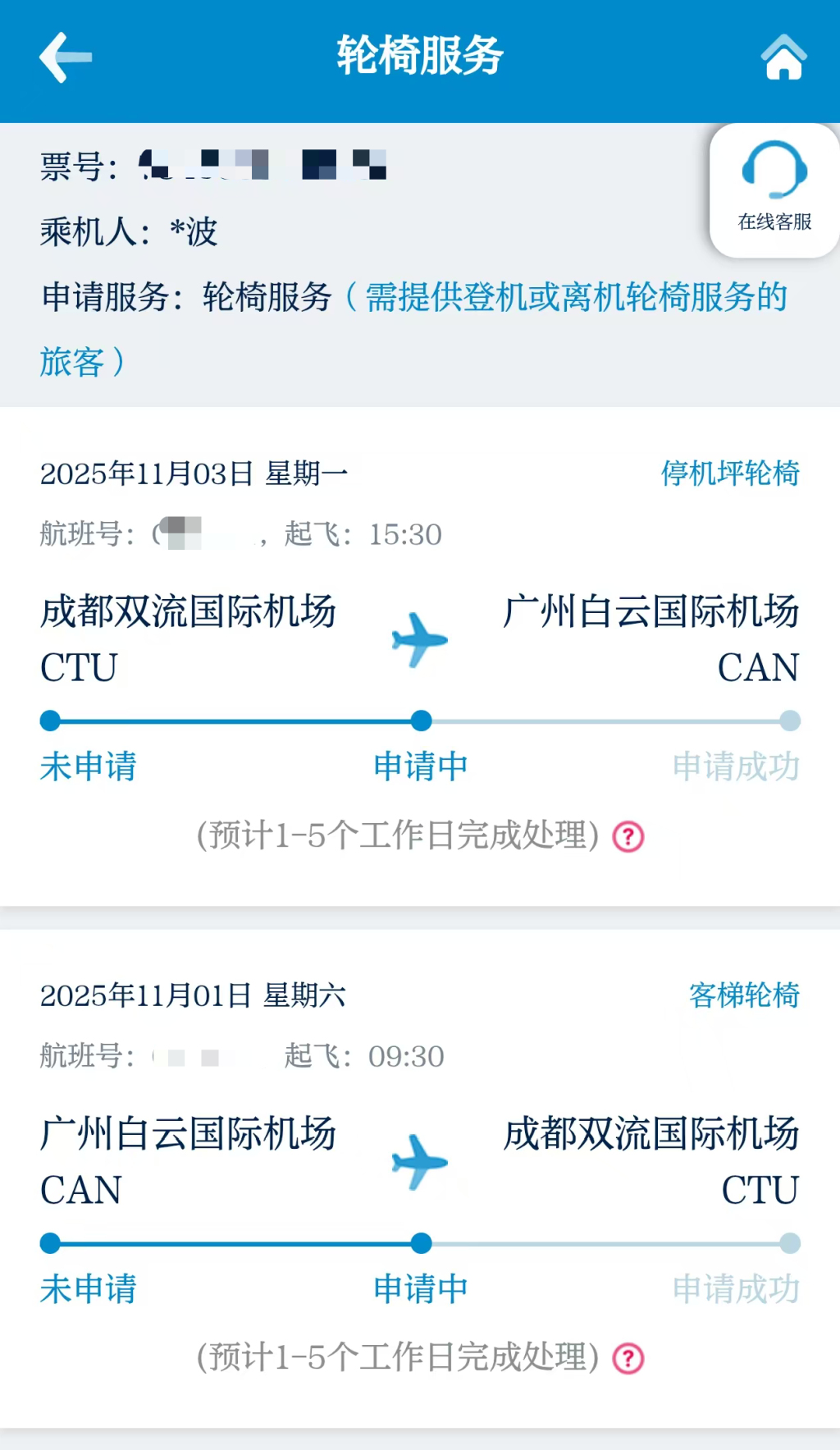 由于不能走远,胡波坐飞机时必须申请轮椅服务。接受采访当天,他刚订好成都和广州之间的往返航班,正申请轮椅服务。胡波提到,他目前遇到比较大的难题是,如果坐地铁或者打车到机场,从下车处到获取轮椅处,有一段较长的距离需要自行行走,这对他而言比较吃力。与此相对应,飞机抵达目的地后,要是去乘地铁或者打车,也需要轮椅衔接。