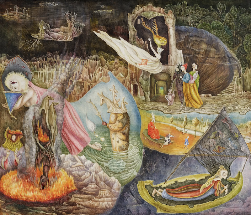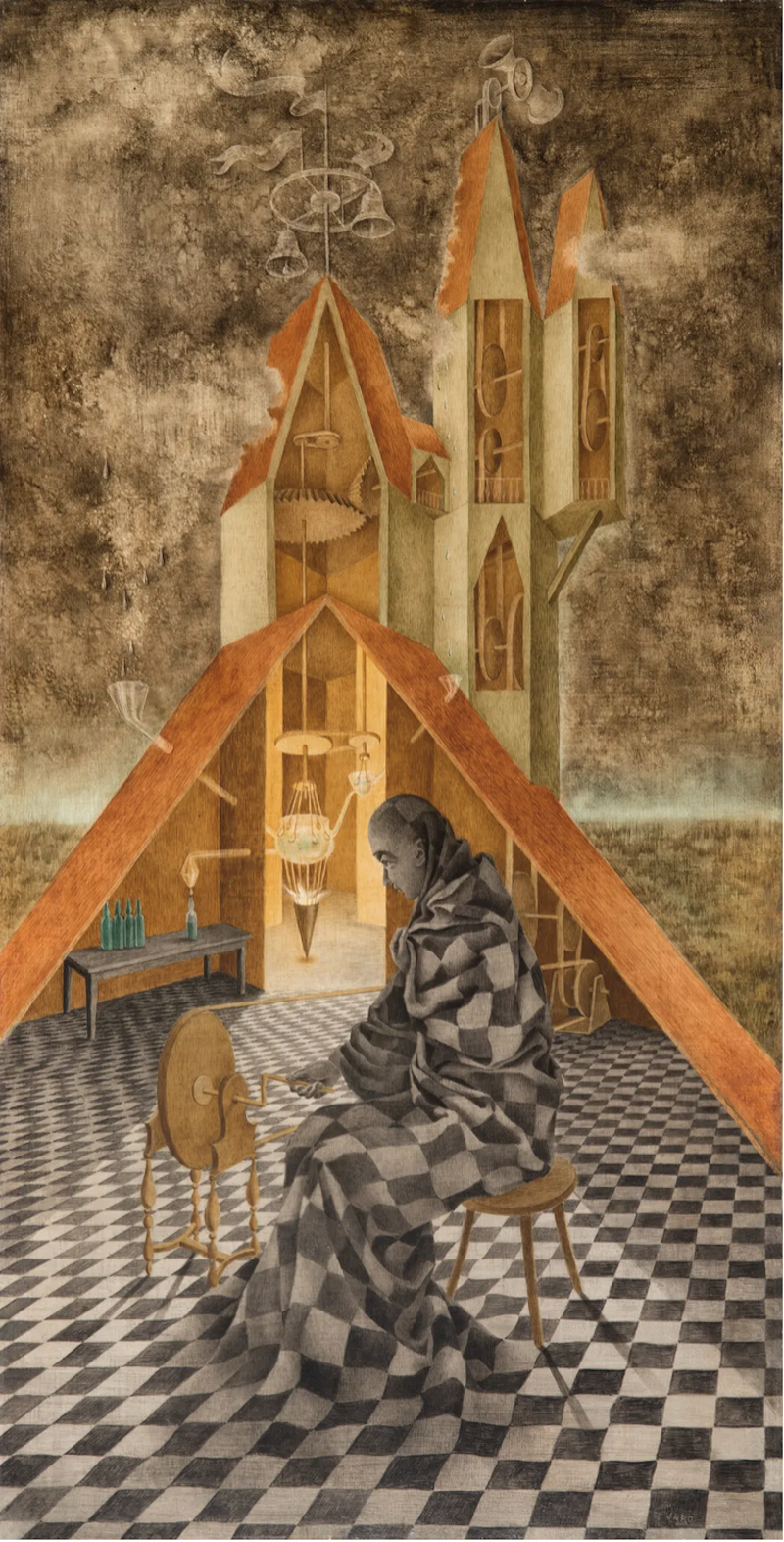 卡林顿的画作与她的好友雷梅迪奥斯·瓦罗的作品遥相呼应。瓦罗是加泰罗尼亚人,后移居墨西哥城。她痴迷于炼金术,擅长描绘奇幻生物,创作了许多精美绝伦的画作。展览中一幅名为《无用的科学,或炼金术士》(1955年)的作品,描绘了一位女子,她身着的斗篷与棋盘格地板融为一体,手中转动着一个鲁布·戈德堡(Rube Goldberg)设计风格的装置。