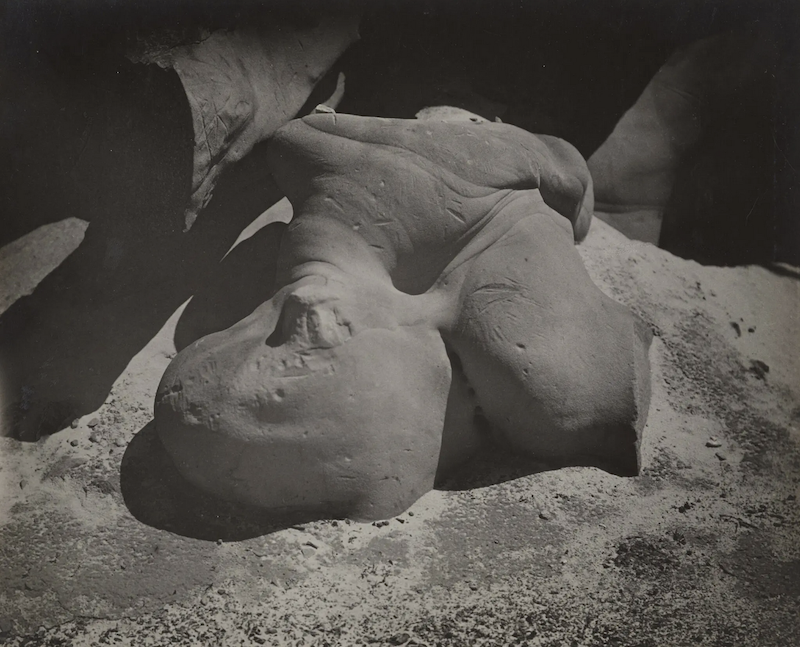 超现实主义从弗洛伊德心理学中汲取了许多灵感,它充满了情欲,在日常生活中发现情色意味。摄影师可以运用光线和构图瞬间将这些潜台词呈现在画面之上。其中,李·米勒在这方面的成就就无人能及。她于20世纪30年代拍摄的两幅风景照极具暗示性,镜头之下是性感而下垂的巨石,宛如乳房或臀部。它们甚至比安德烈·柯特兹于1933年在游乐园里借助哈哈镜拍摄的扭曲裸体照片,或是布拉塞那张优雅的金属剪刀照片更性感。