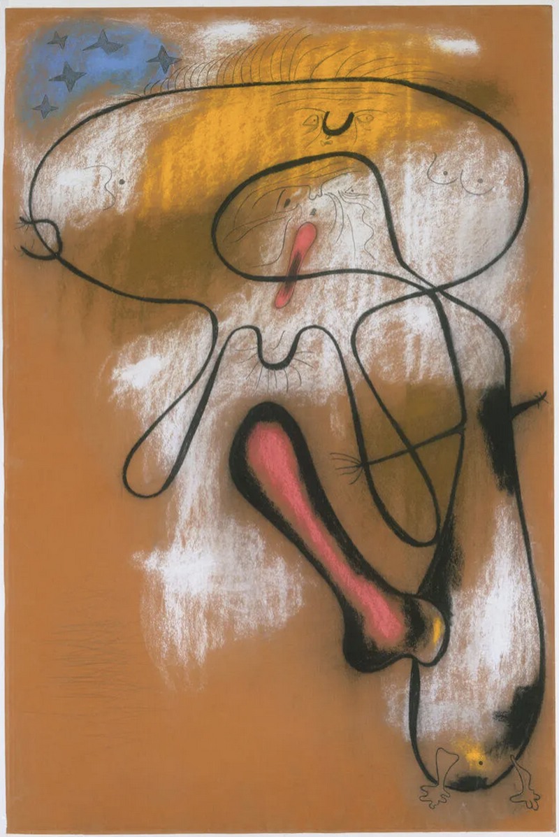 胡安·米罗的成就远胜于此。他那些充满奇幻生物和抽象形状的神秘画作,仿佛是不由自主地从他内心深处涌现而出的。正因如此,在布雷顿看来,“米罗或许可以算得上是我们所有人中最’超现实主义’的一位。” 米罗为了营造这种效果付出了诸多努力,有时甚至会以拼贴画作为习作。例如,他为《绘画》(1933)所做的创作,画面色彩绚丽,描绘的生物形态则有着毛茸茸的突起处与凹陷处。这幅画是他在那一时期创作的一系列作品之一,与另一幅作品《恋人》(1934)一起,游走在纯真和情欲之间。