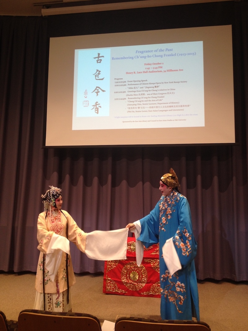 追思会上,先生亲友怀念之辞深切感人。沈从文先生的儿子沈虎雏(母亲张兆和是张充和三姐)专程从中国前往耶鲁参加纪念活动。纽约昆曲社演出的“思凡”和“惊梦”两出折子戏极为成功。我至今还能记得有一位先生学生的发言提到一个细节,充和先生不仅教授昆曲,还曾自制演出服饰。耶鲁历史系金安平(Annping Chin)女士出版过《合肥四姐妹》(张氏四姐妹祖籍合肥)一书,她发言的题目是“张充和的艺术人生”。耶鲁东亚语言文学系苏炜先生谈“张充和与‘雅’文化——传统中国文人文化的精粹及其失落和传承”。追思会后,在图书馆东亚部有个小型的招待会,我随美术馆亚洲部主任江文苇(David Sensabaugh)先生一起前往,观瞻了充和先生的墨迹和相关书籍。耶鲁“东亚图书馆”牌匾即为充和先生所书。
