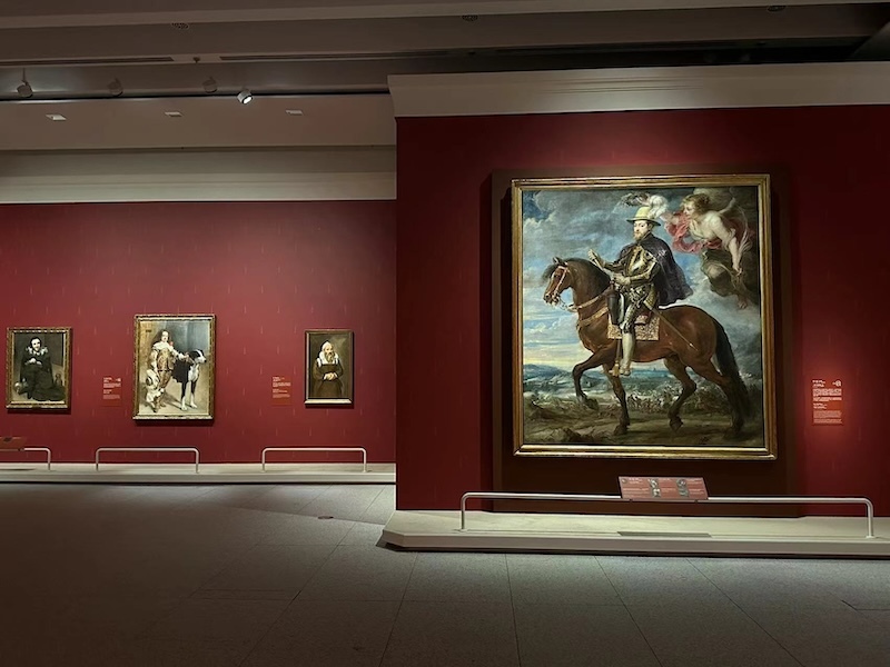 “光辉时代:普拉多博物馆中的西班牙往事”展览现场,鲁本斯《马背上的费利佩二世》(右)与俳优画