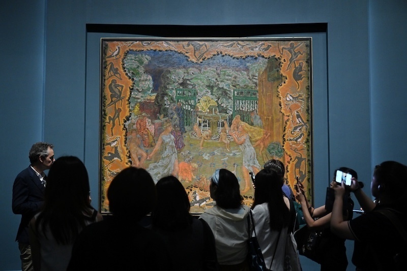 2025年6月,“奥赛展”开幕日,策展人斯特凡纳·盖冈(左一)在展览现场介绍博纳尔作品《欢愉》