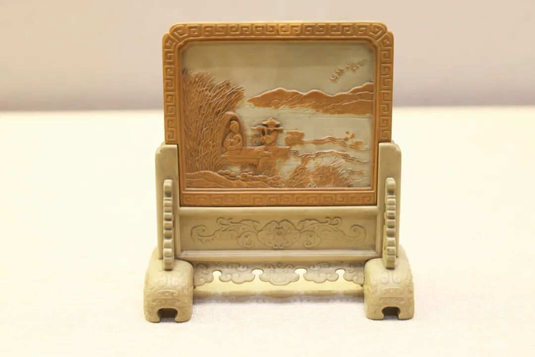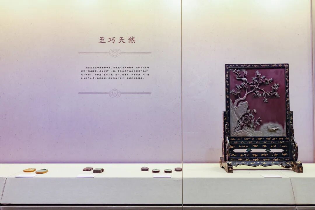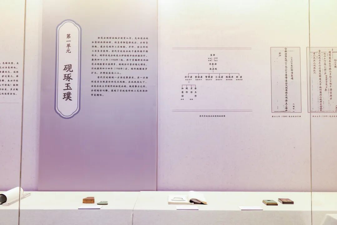 展厅以“砥山之石”“砚琢玉璞”“几暇格物”“嘉礼相予”“铭砚观心”五个部分次第展开,脉络清晰地呈现了松花石砚从发现到成为宫廷御品的历程,展示清代宫廷精湛的制砚技艺及深厚的文化内涵。