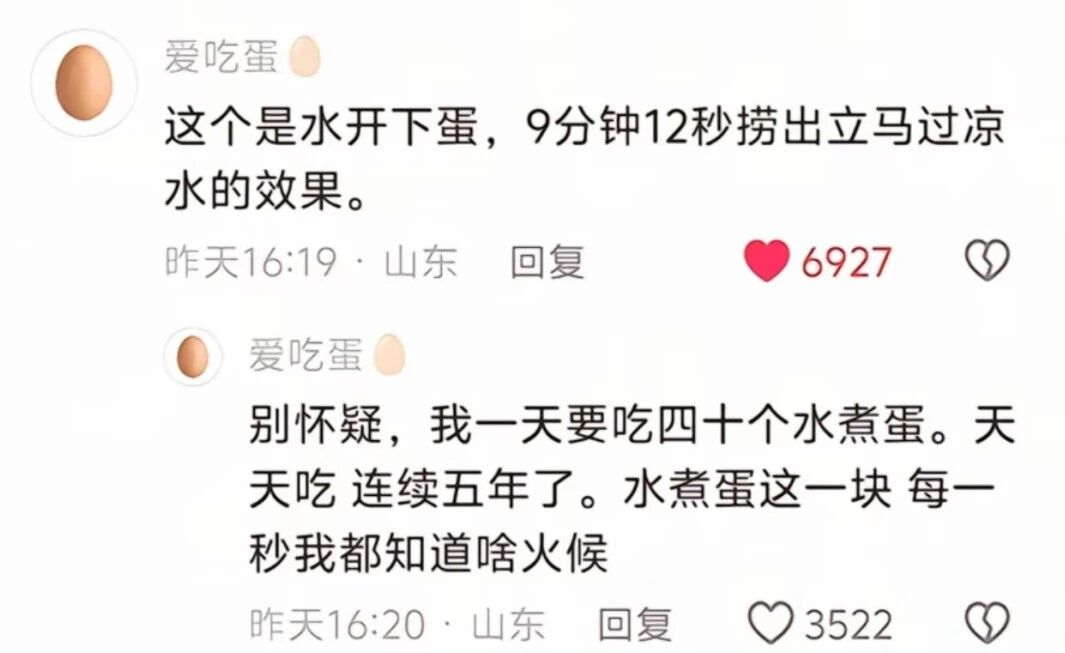12月4日,有网友分享“父亲煮的完美水煮蛋”,抖音博主“爱吃蛋”在评论区指出:“这个是水开下蛋,9分12秒捞出立马过凉水的效果。”为了印证这一教程的可行性,他还补充称自己“一天要吃四十个水煮蛋。天天吃,连续五年了。”