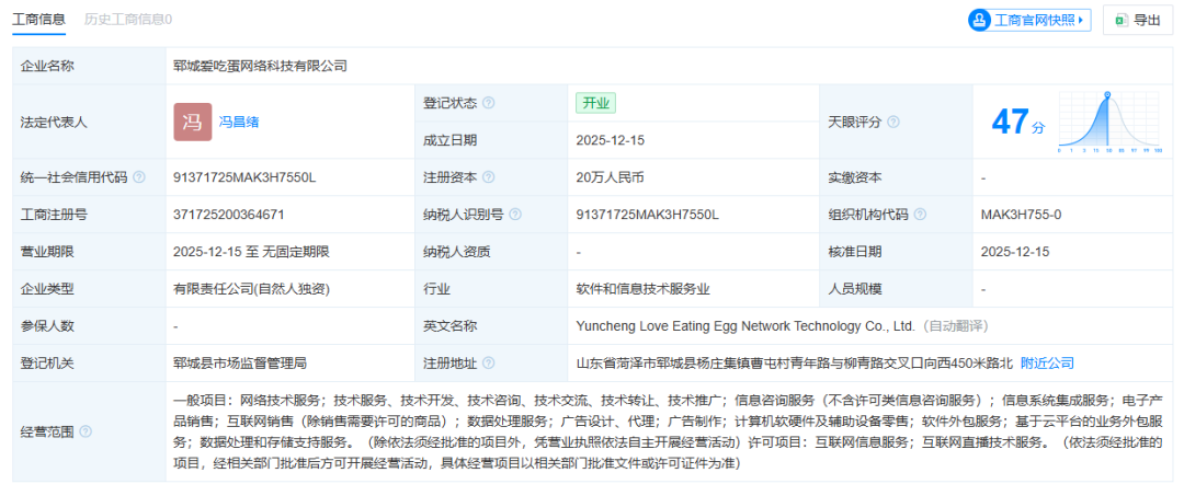近日,热搜话题 #400万煮鸡蛋大神开公司了# 引发围观。天眼查信息显示,郓城爱吃蛋网络科技有限公司于12月15日正式注册,法定代表人正是博主“爱吃蛋”冯昌绪,公司业务涵盖互联网销售、直播技术服务等。
