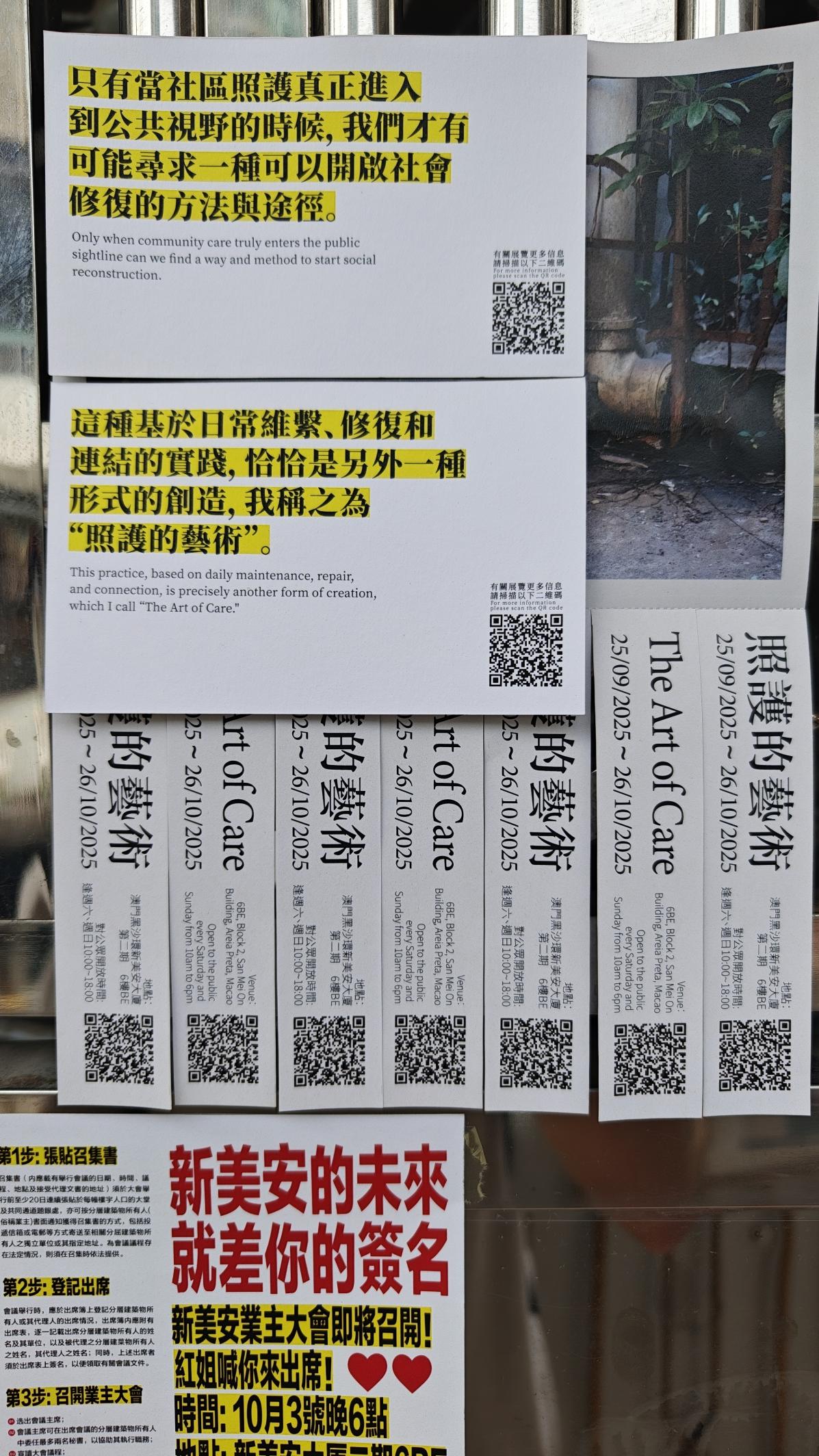 徐建华:最成功的是增加了社区的“可见性”。不仅让大厦内部居民看到了建立业主会的重要性,也让整个澳门社会看到了这栋大楼。澳门人均 GDP 全球第二,但在金碧辉煌之下,还有这样的社区需要被看见、被改善。具体展品中,我很喜欢艺术家张晓的作品。他在新美安住了5天,创作了36本杂志,比如拍水管、拍中元节路边的“烧衣(祭祀)”痕迹,甚至把新美安包装成房产广告,充满了讽刺和深意。