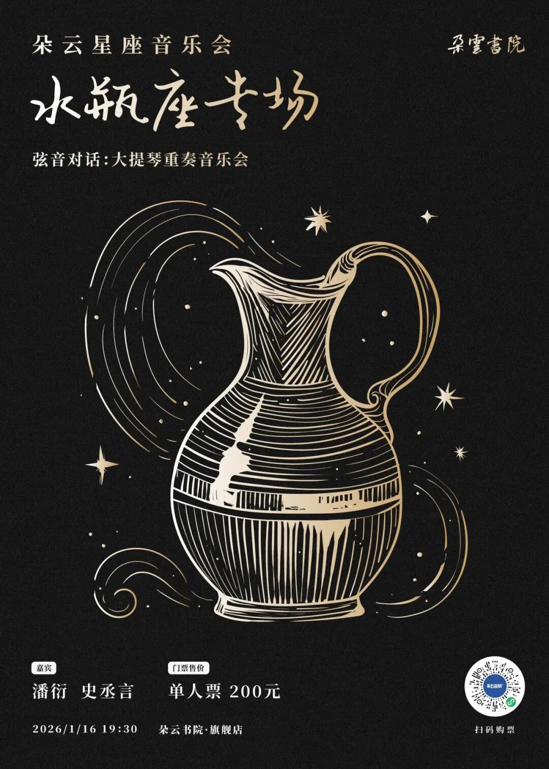 2026年1月16日(周五)19:30,在朵云书院·旗舰店好望南角,由大提琴家潘衍领衔,联合史丞言,将呈现朵云星座音乐会之水瓶座专场,以大提琴重奏,展开一场充满智性与诗意的弦间“对话”。